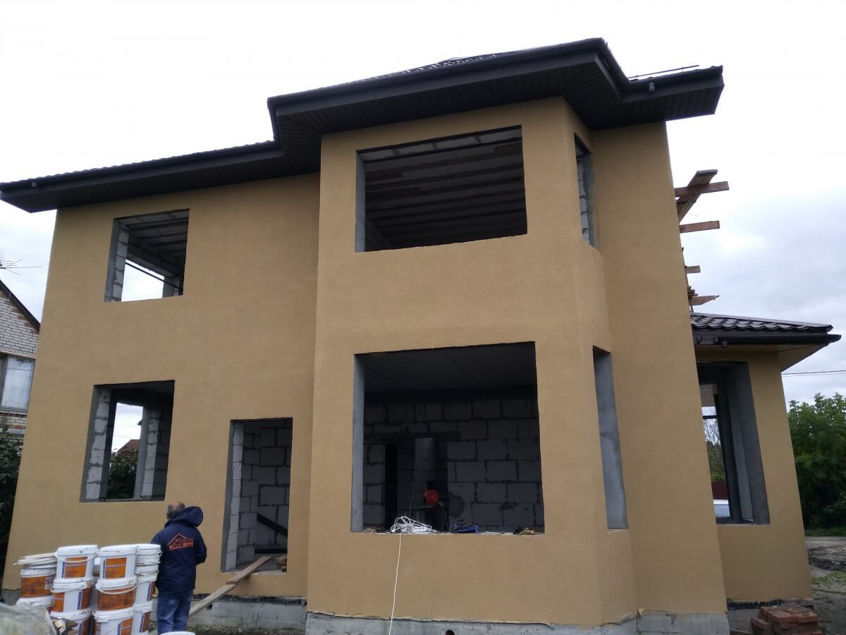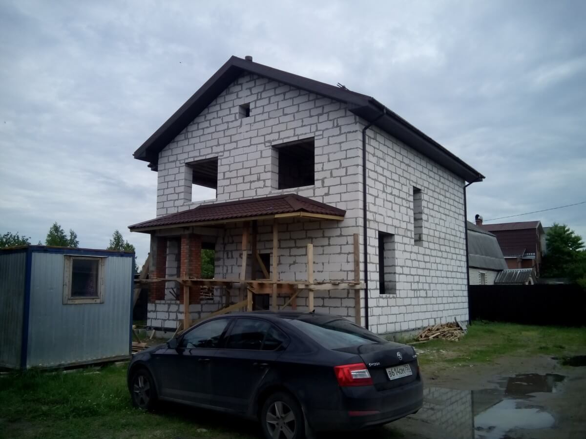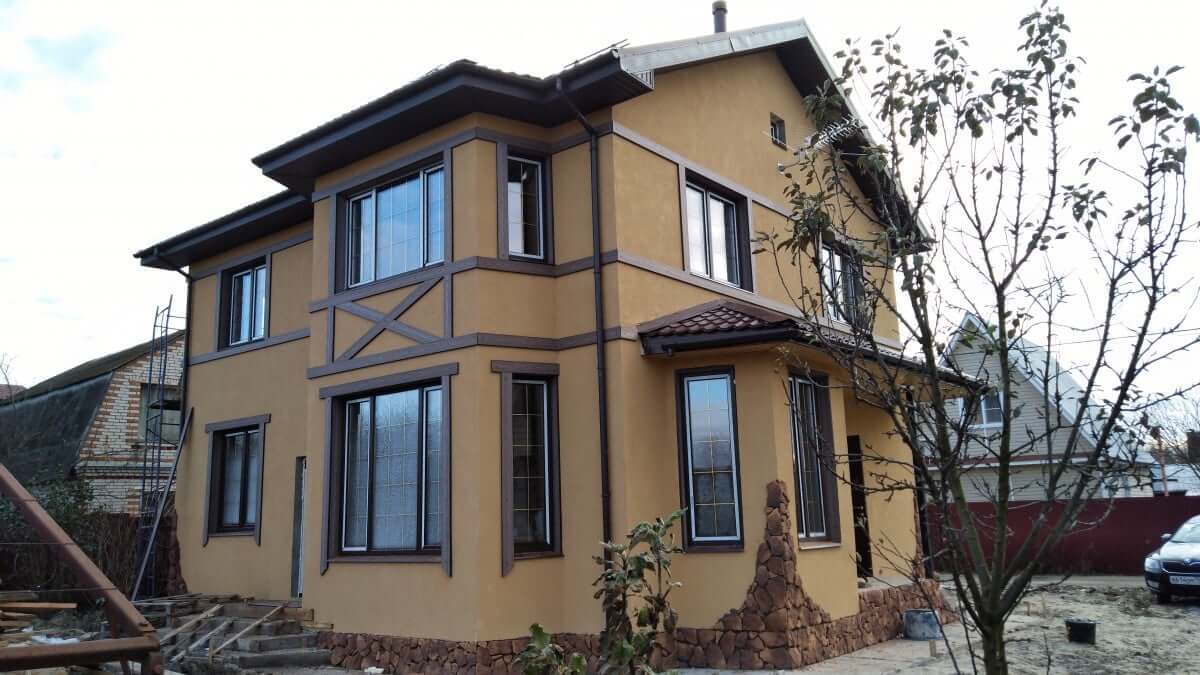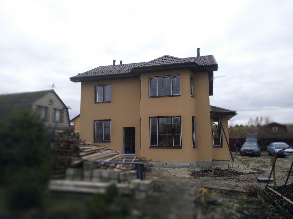 Строительство дома из газобетона в д. Петровское, Раменский район. Наружная отделка - декоративная штукатурка "Барашек" на силиконовой основе, отделка элементов фасада - искусственный камень.