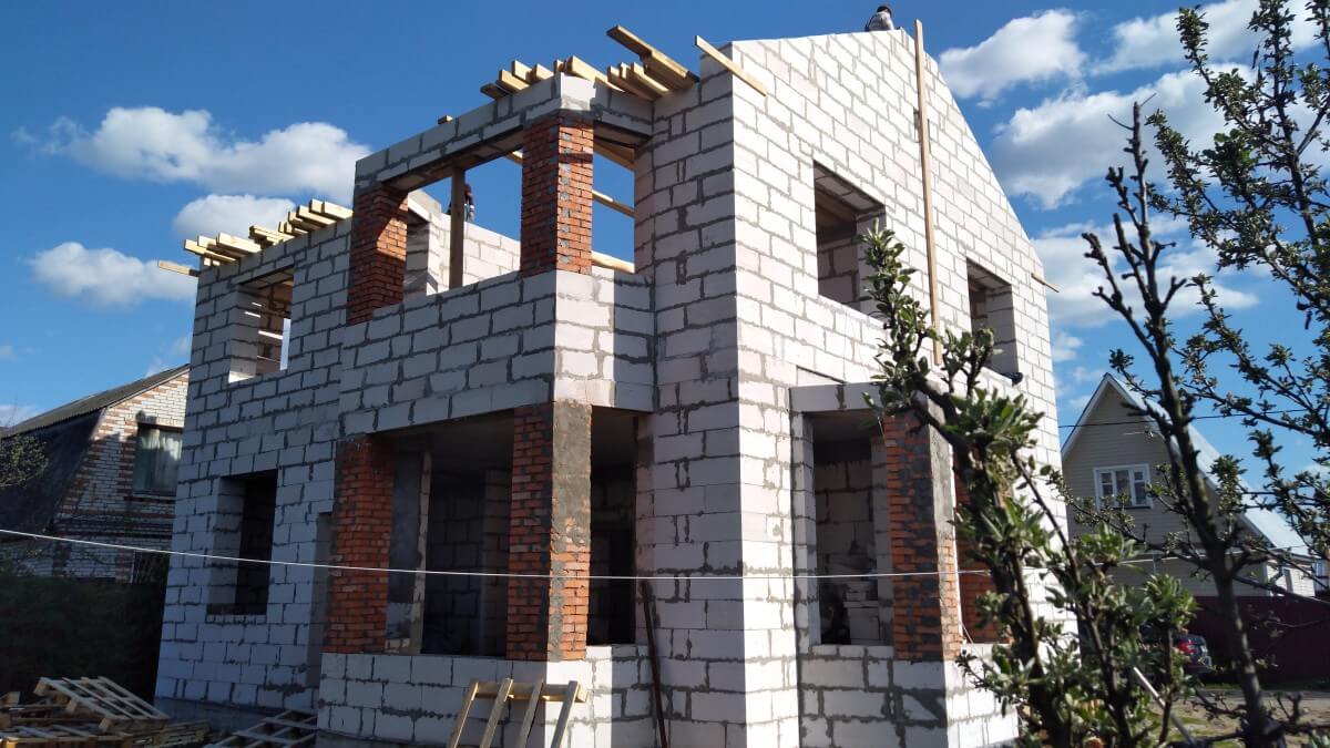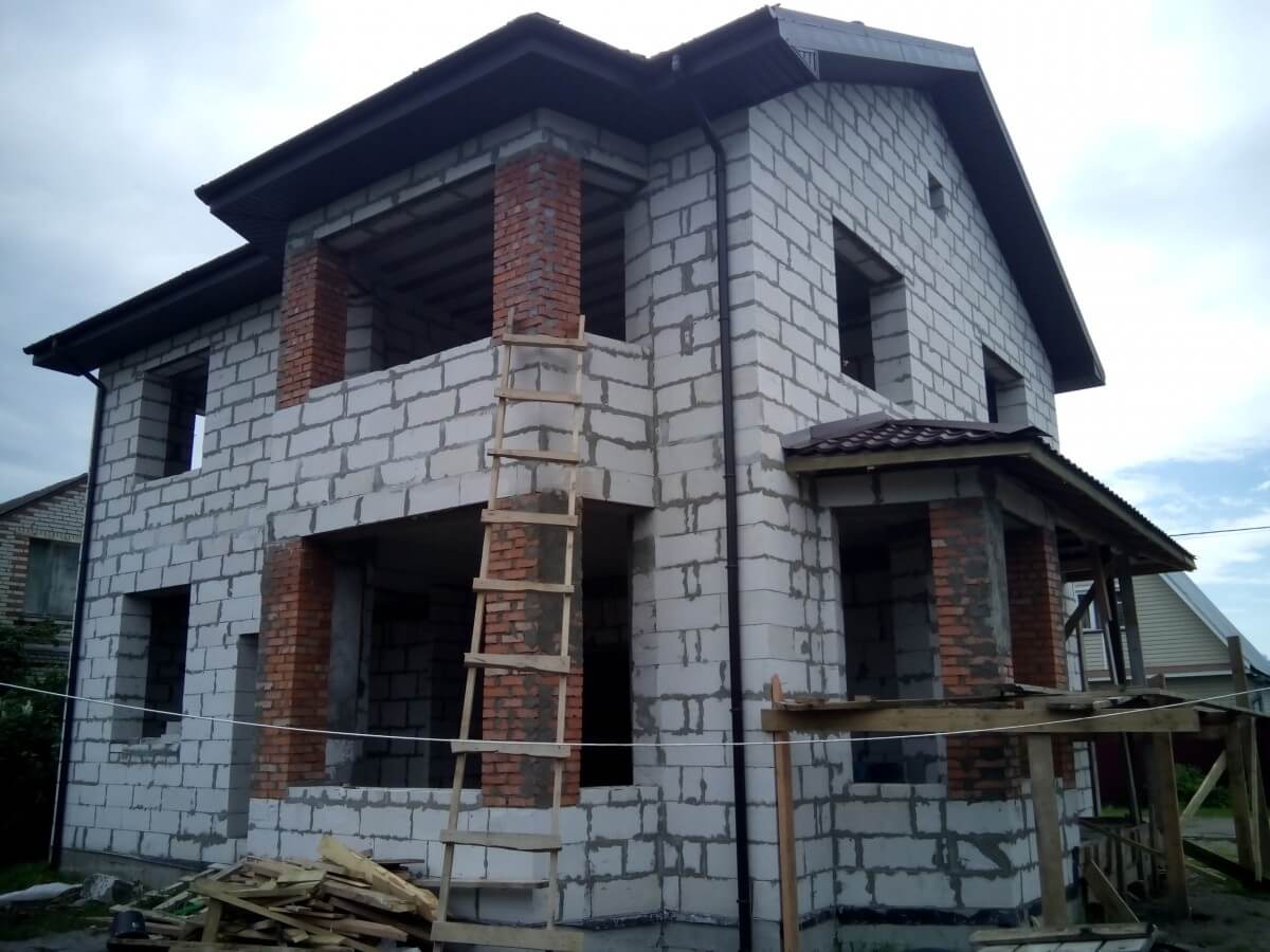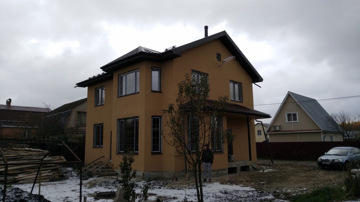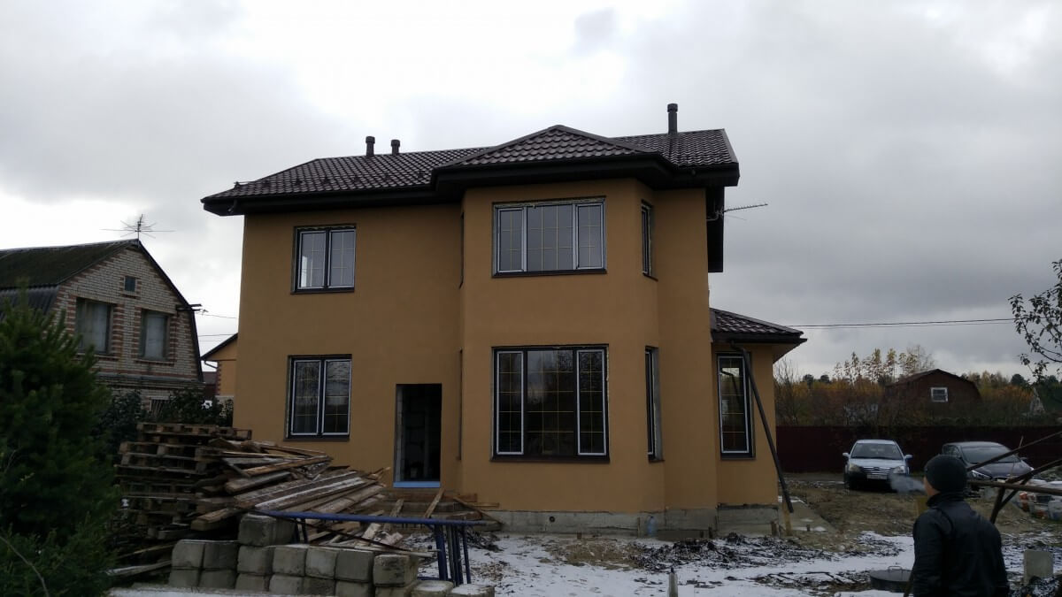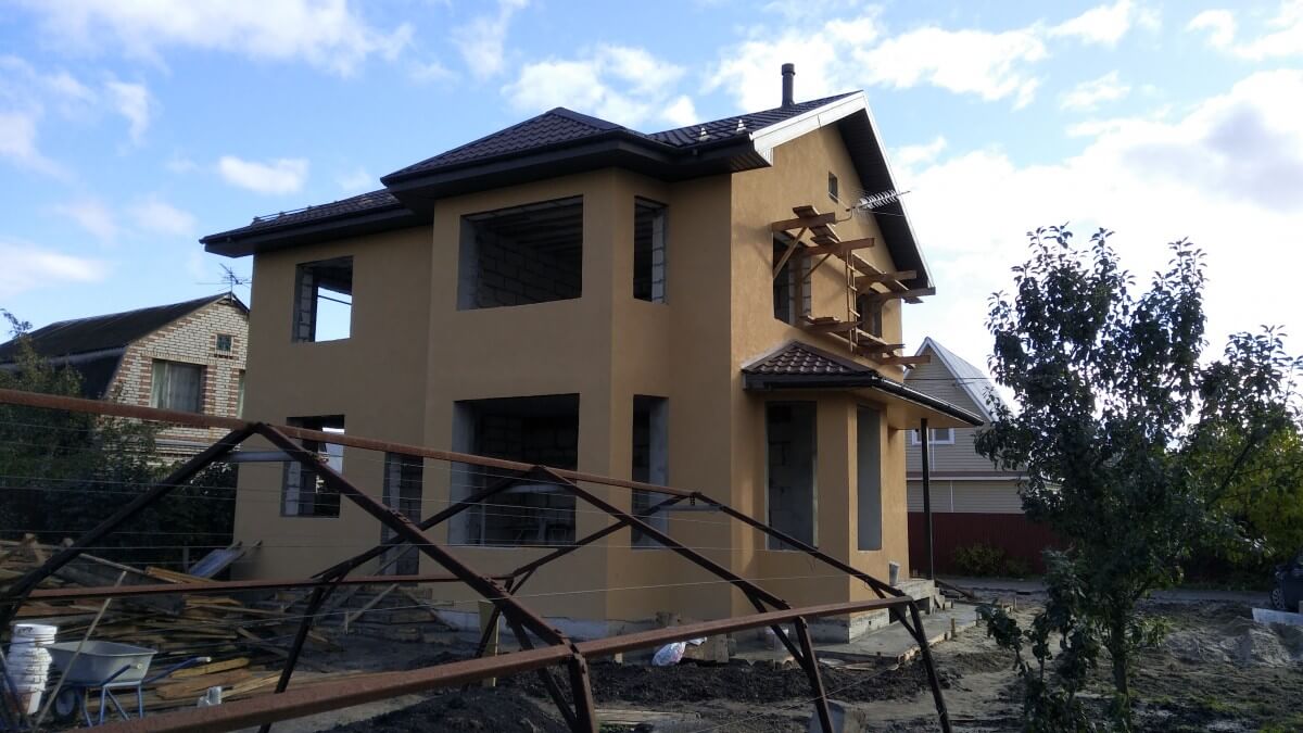 Строительство дома из газобетона в д. Петровское, Раменский район. Наружная отделка - декоративная штукатурка "Барашек" на силиконовой основе, отделка элементов фасада - искусственный камень.