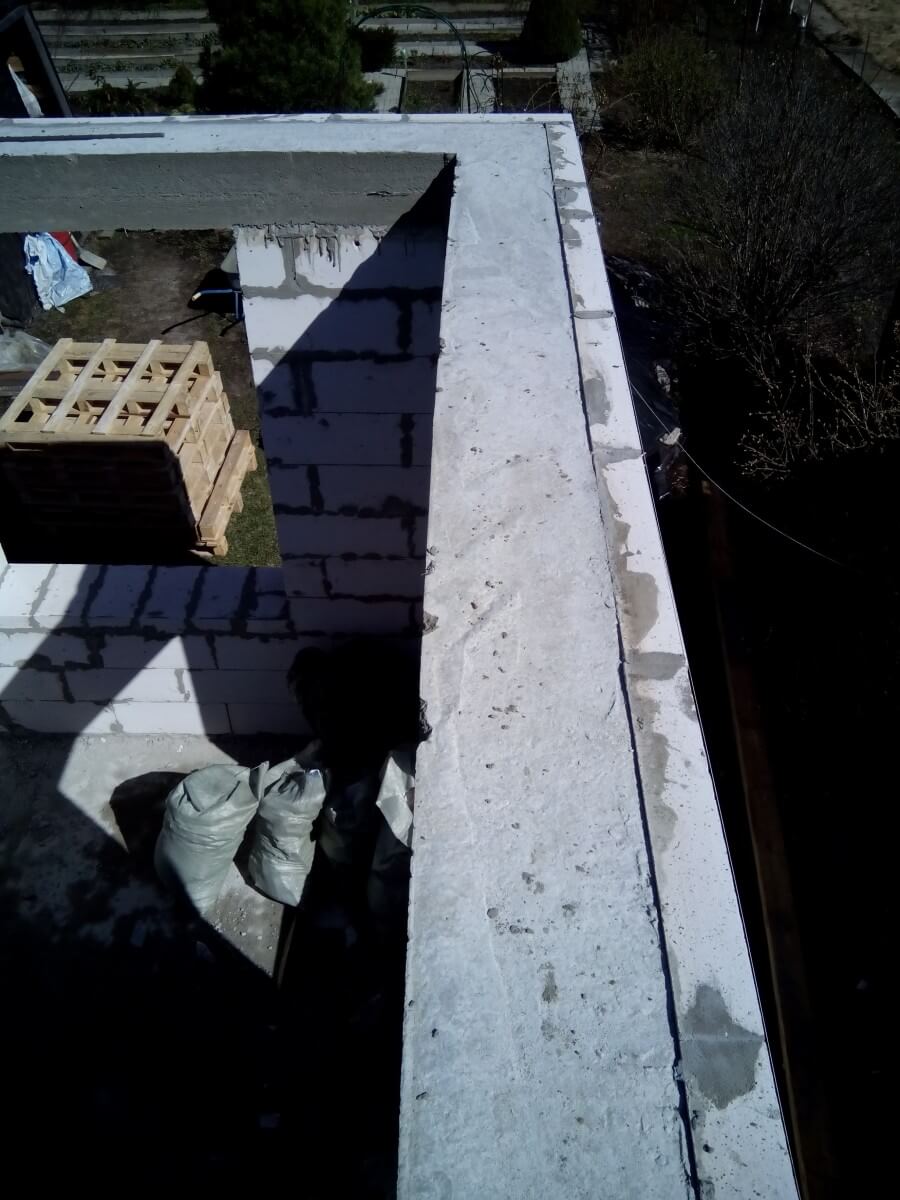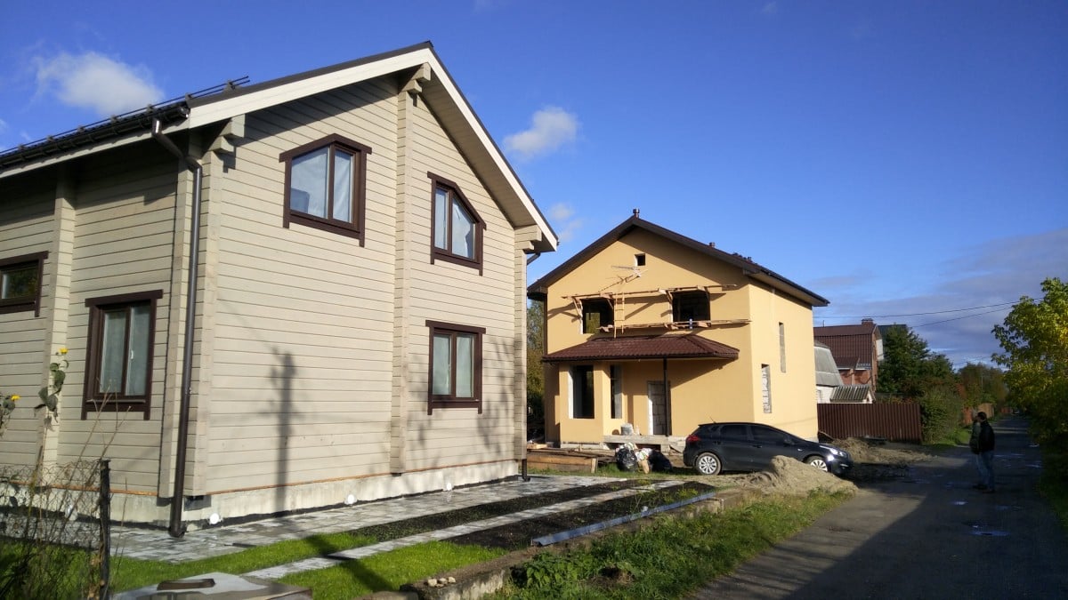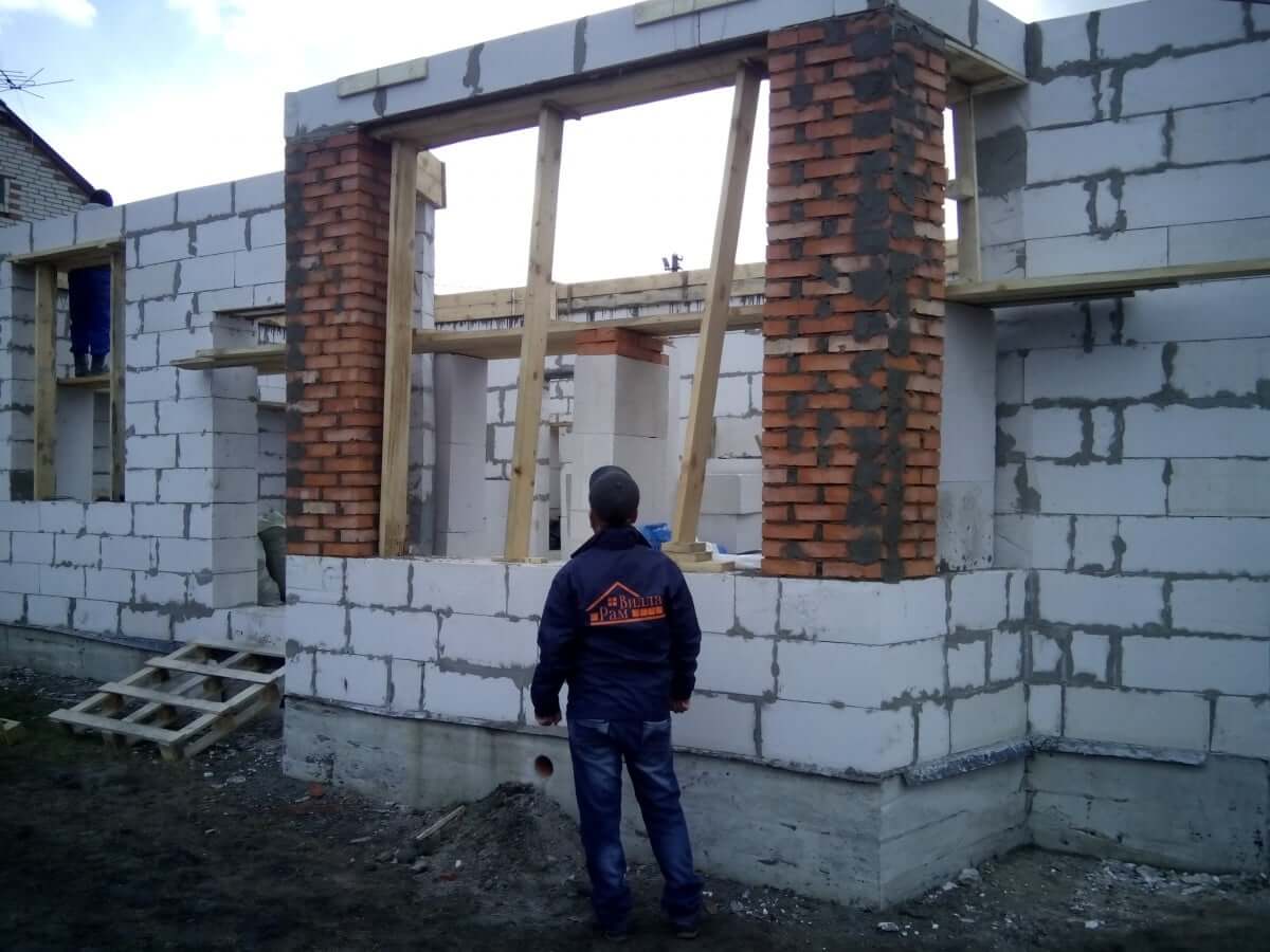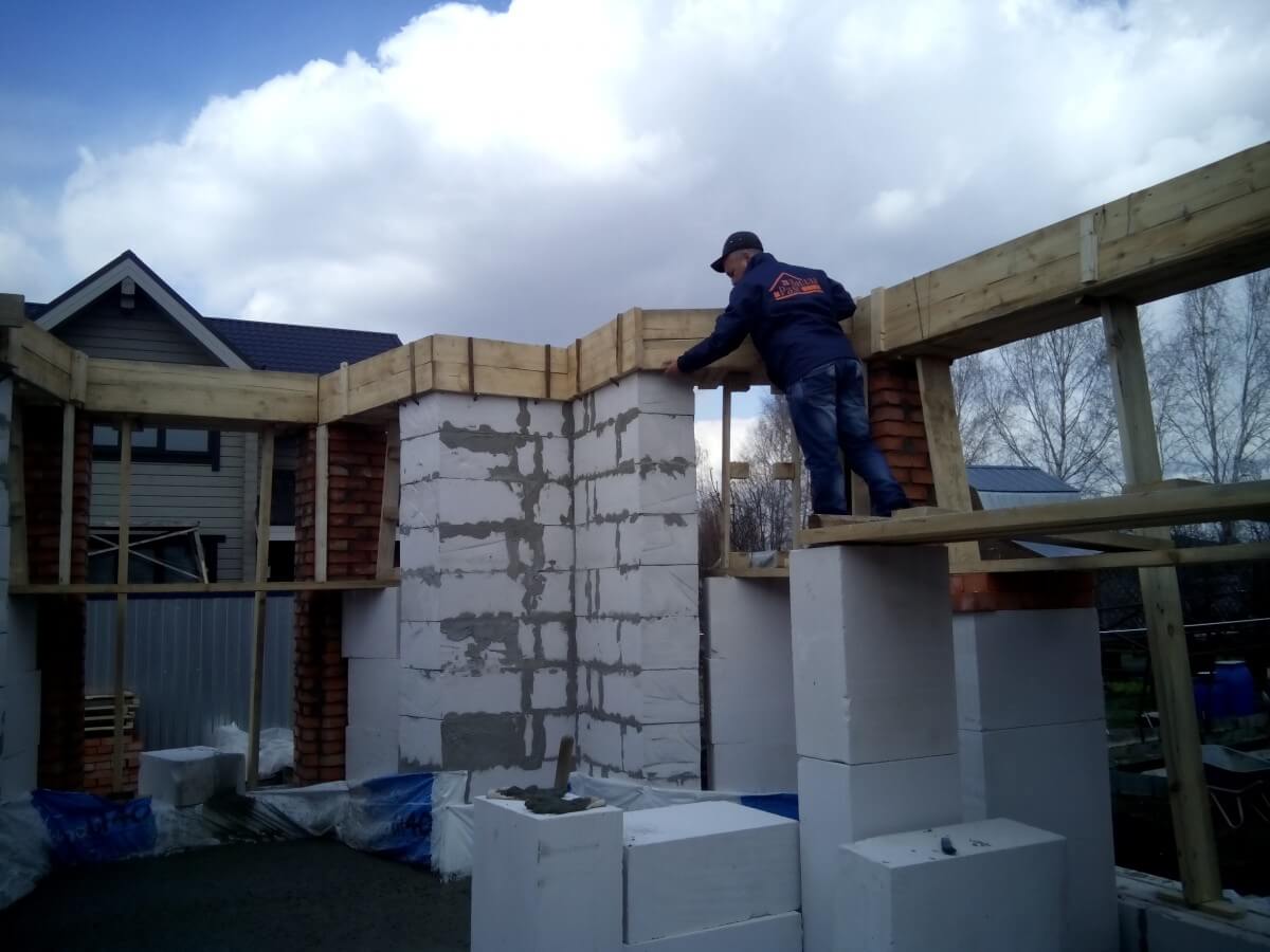 Строительство дома из газобетона в д. Петровское, Раменский район. Наружная отделка - декоративная штукатурка "Барашек" на силиконовой основе, отделка элементов фасада - искусственный камень.