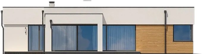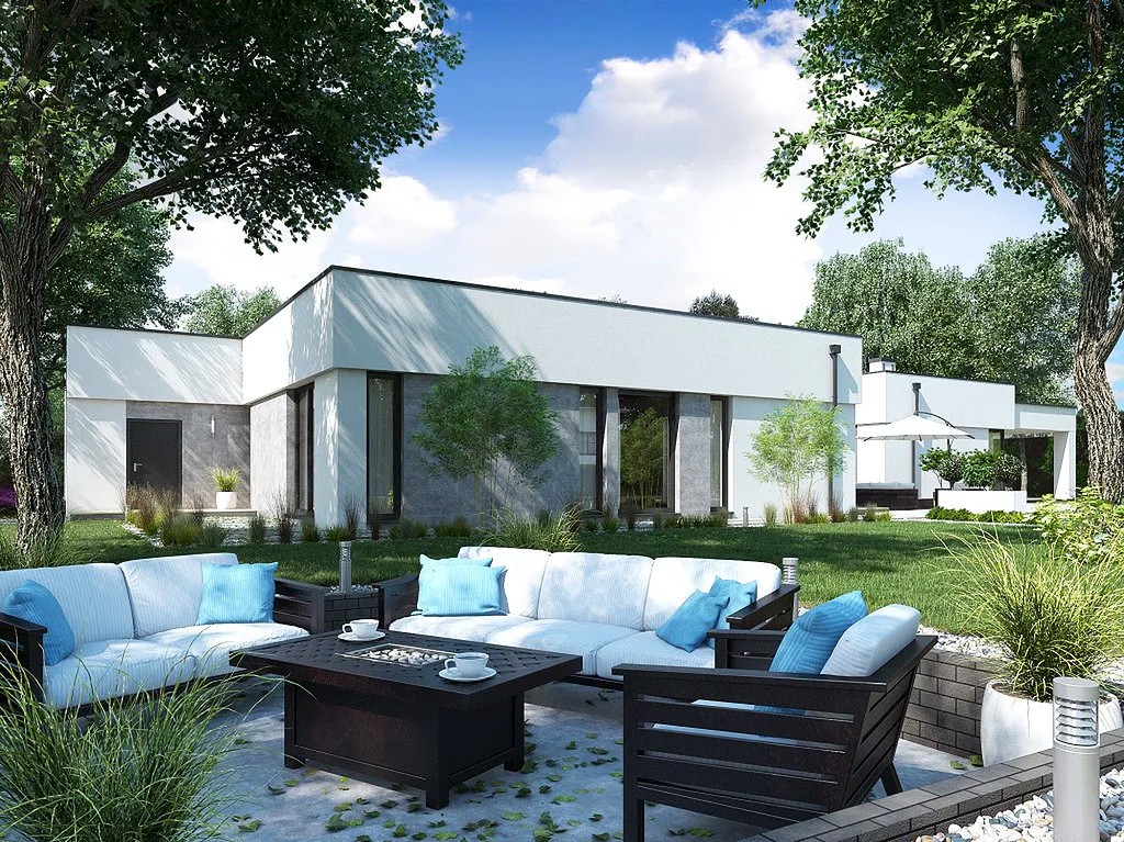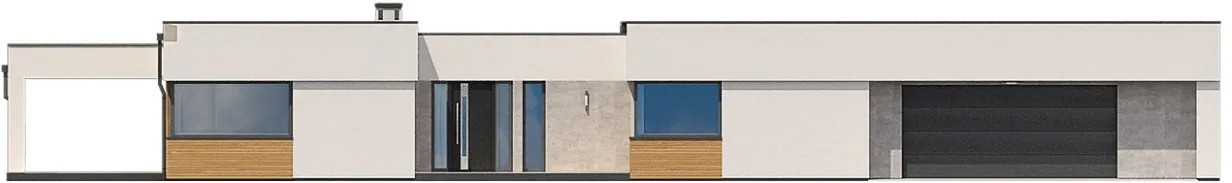 Центральный вход в одноэтажный Дом 16 на 27 будет сделан со стороны веранды. В дом можно попасть через летний сад и гаражные двери.