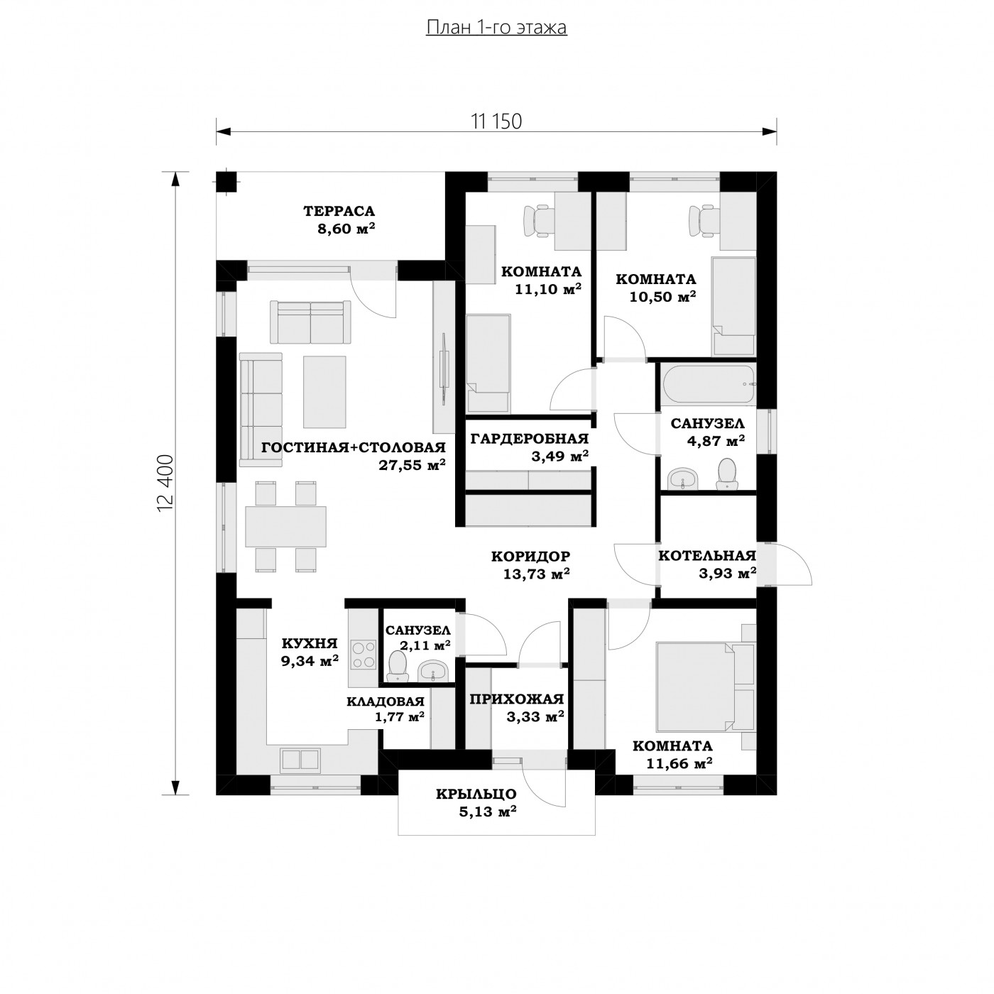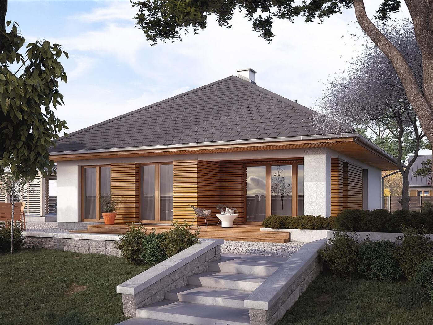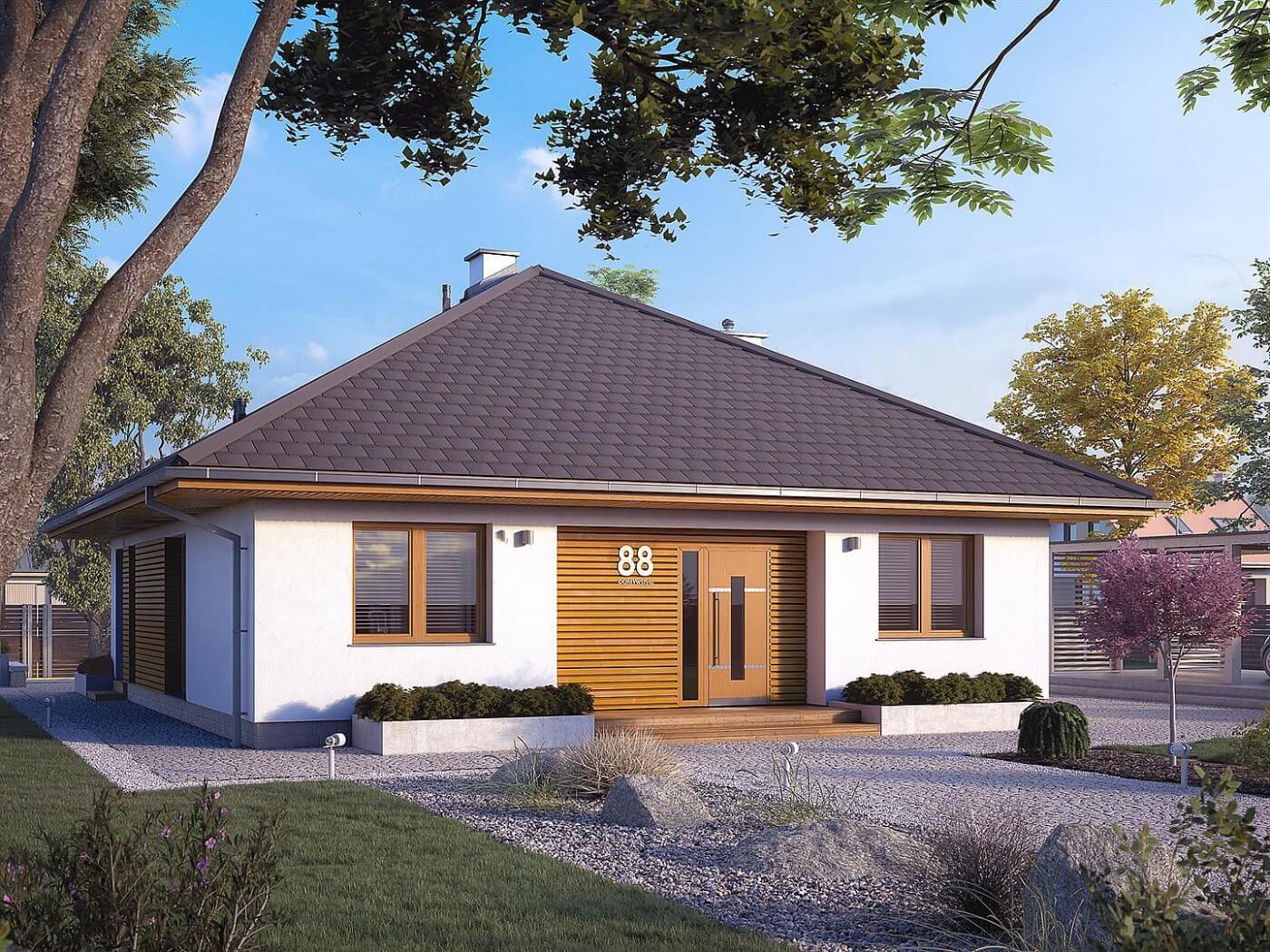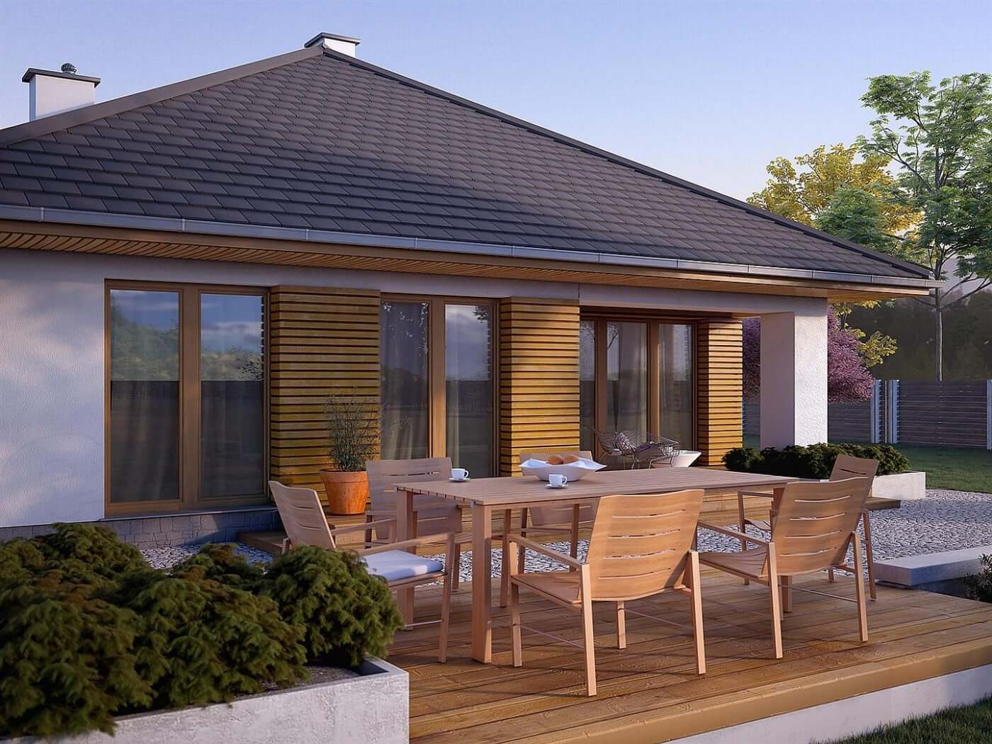 Проект одноэтажного дома габаритами 11 на 12 Вильнюс с вальмовой крышей и террасой.