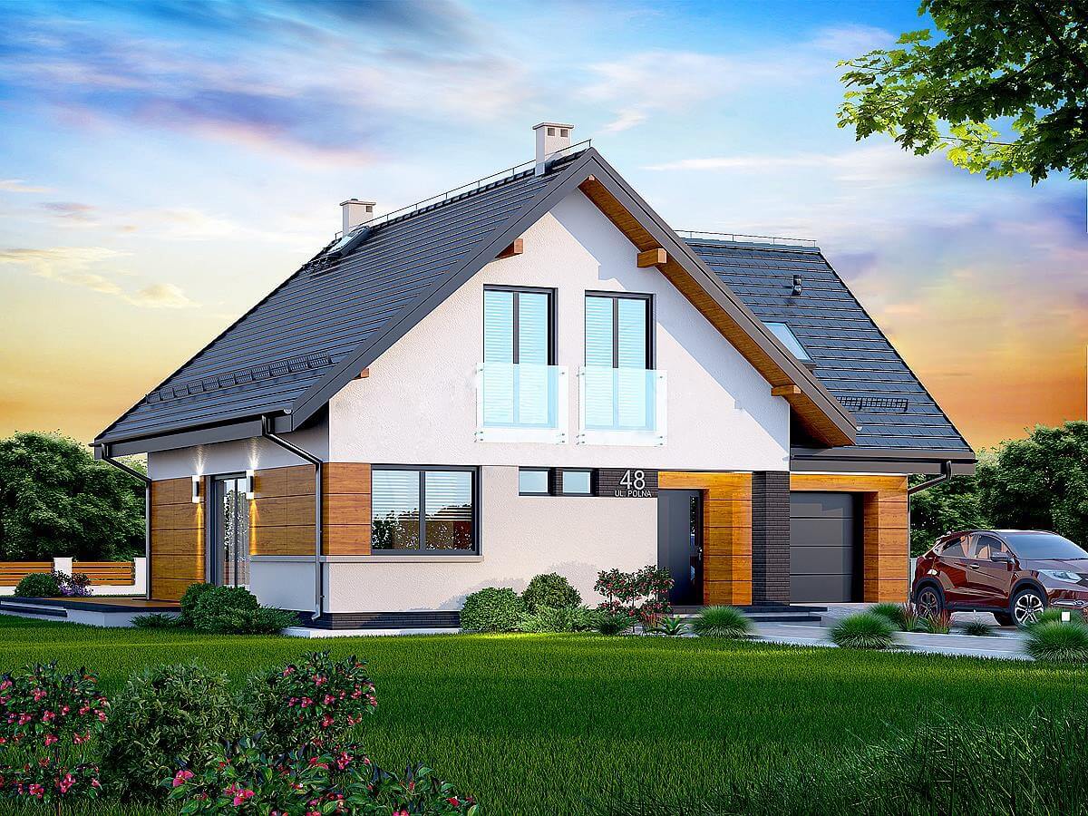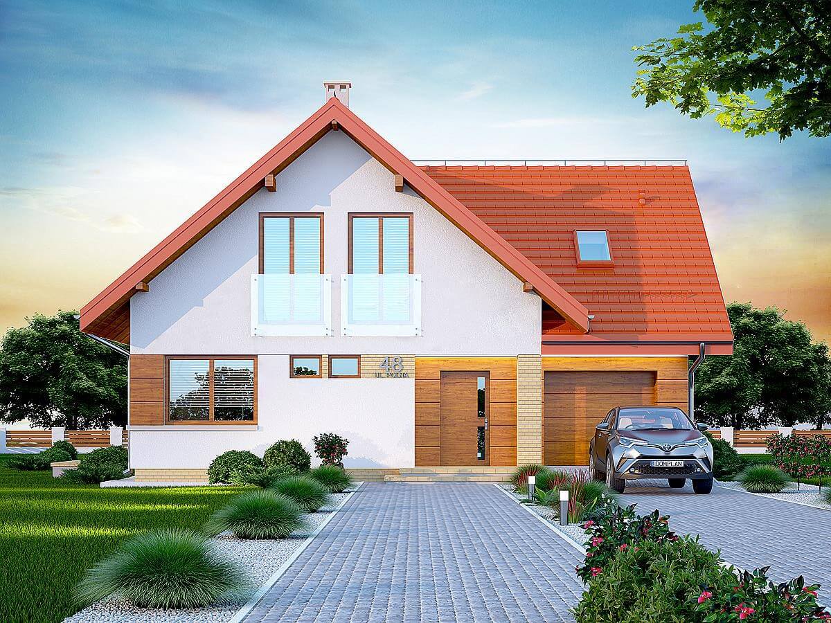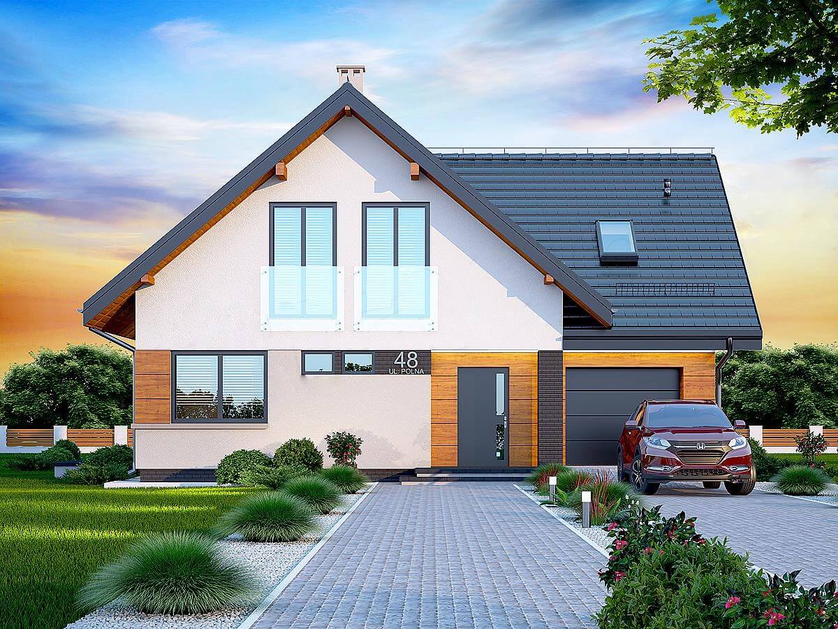 План дома "Осло" рассчитан на участок средней ширины. Дом имеет типичные размеры 10 х 12, поэтому его постройка обойдется не дорого. Проект относится к категории домов с выступом, направленным перпендикулярно дороге, что часто указывается в плане пространственного развития. Проект был создан для земельных участков, позволяющих отдельно стоящие здания. Проект может быть расположен на границе участка, что позволяет строить двухквартирные дома. Автор проекта предсказал наличие единственного гаража в линии строительства. Это также отличное предложение для людей, которые ищут дом с двускатной крышей, что снижает расходы. Проект "Осло" представляет собой одноэтажный дом с мансардой, благодаря которому мы можем наслаждаться большой площадью, даже на относительно небольшом участке. Сердцем дома является просторная дневная зона, в которой приятно проводить время вместе с близкими. Кроме того, просторная кладовая - полезная комната. Дневная зона также создает просторную гостиную со столовой, благодаря которой члены домохозяйства могут объединиться в одном месте. Камин, расположенный в гостиной, не только выглядит великолепно, но и обеспечивает приятное тепло в прохладные дни. Полностью функциональная ванная комната предусмотрена как на первом этаже, так и на чердаке, что является отличным решением для большего количества членов семьи. Спальная зона состоит из четырех комнат, Это отличный вариант для семьи из 4-6 человек. Пространство также может быть использовано в качестве комнаты для гостей или учебы. В доме также было место для практических хозяйственных помещений. Терраса является идеальным местом для организации семейных торжеств и минут отдыха.