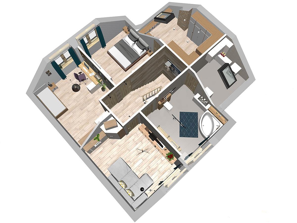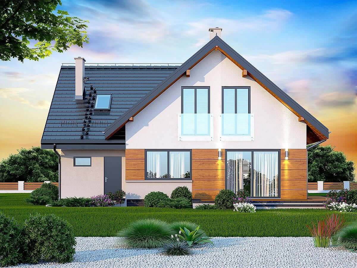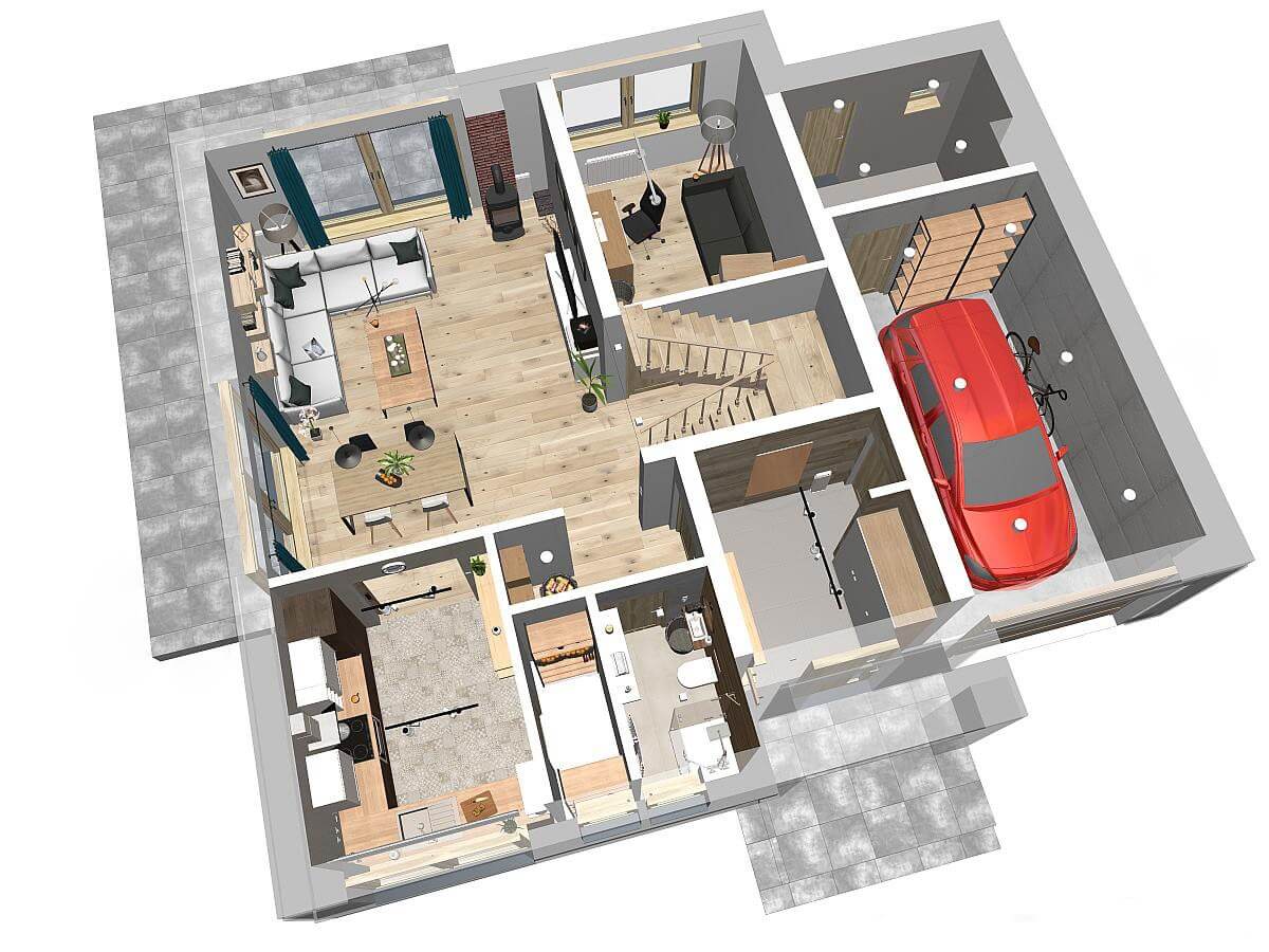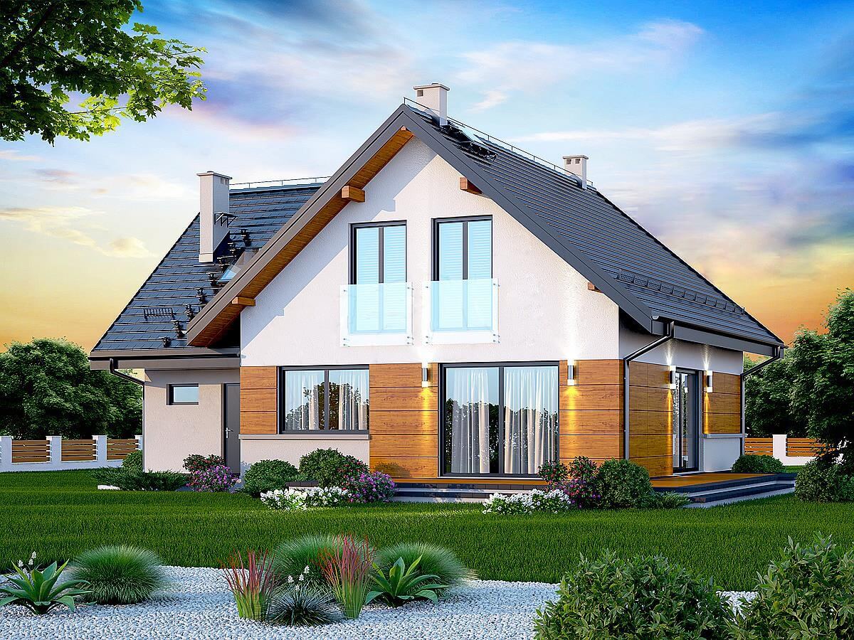План дома "Осло" рассчитан на участок средней ширины. Дом имеет типичные размеры 10 х 12, поэтому его постройка обойдется не дорого. Проект относится к категории домов с выступом, направленным перпендикулярно дороге, что часто указывается в плане пространственного развития. Проект был создан для земельных участков, позволяющих отдельно стоящие здания. Проект может быть расположен на границе участка, что позволяет строить двухквартирные дома. Автор проекта предсказал наличие единственного гаража в линии строительства. Это также отличное предложение для людей, которые ищут дом с двускатной крышей, что снижает расходы. Проект "Осло" представляет собой одноэтажный дом с мансардой, благодаря которому мы можем наслаждаться большой площадью, даже на относительно небольшом участке. Сердцем дома является просторная дневная зона, в которой приятно проводить время вместе с близкими. Кроме того, просторная кладовая - полезная комната. Дневная зона также создает просторную гостиную со столовой, благодаря которой члены домохозяйства могут объединиться в одном месте. Камин, расположенный в гостиной, не только выглядит великолепно, но и обеспечивает приятное тепло в прохладные дни. Полностью функциональная ванная комната предусмотрена как на первом этаже, так и на чердаке, что является отличным решением для большего количества членов семьи. Спальная зона состоит из четырех комнат, Это отличный вариант для семьи из 4-6 человек. Пространство также может быть использовано в качестве комнаты для гостей или учебы. В доме также было место для практических хозяйственных помещений. Терраса является идеальным местом для организации семейных торжеств и минут отдыха.