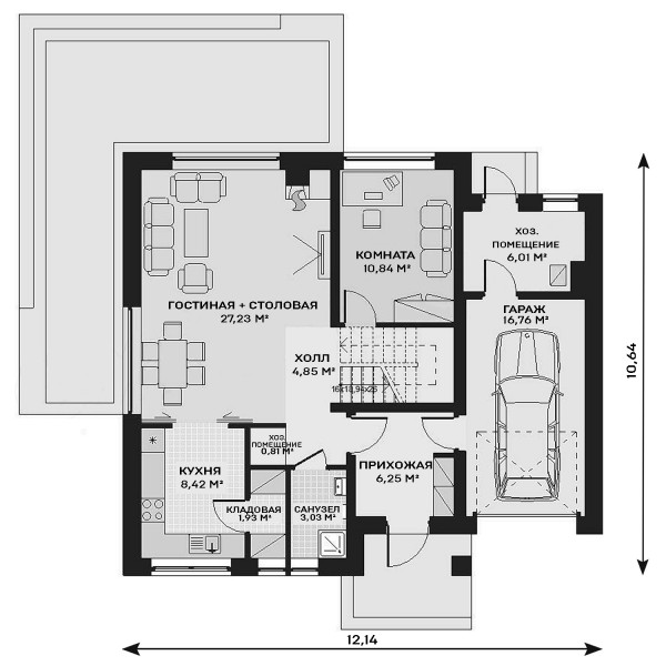 1 этаж 1 прихожая 6,25 м² 2 холл 4,85 м² 3 кухня 8,42 м² 4 кладовая 1,93 м² 5 гостиная + столовая 27,23 м² 6 санузел 3,03 м² 7 хоз.помещение 0,81 м² 8 комната 10,84 м² 9 хоз.помещение 6,01 м² 10 гараж 16,76 м² Всего 86,13 м² |