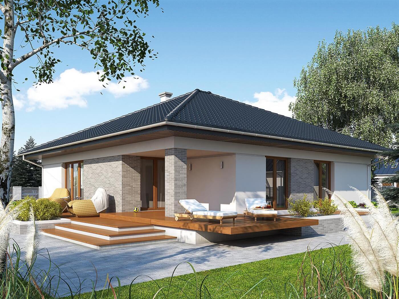 Оригинальный элемент дома «Дублин» – большая терраса, огибающая его с двух сторон. Расположите на ней плетёную мебель и превратите в отличную зону отдыха для всей семьи ?