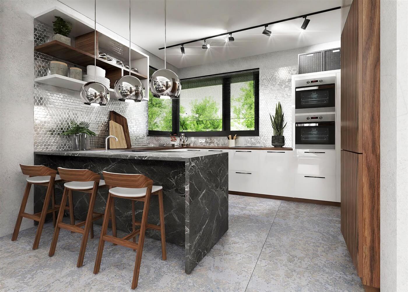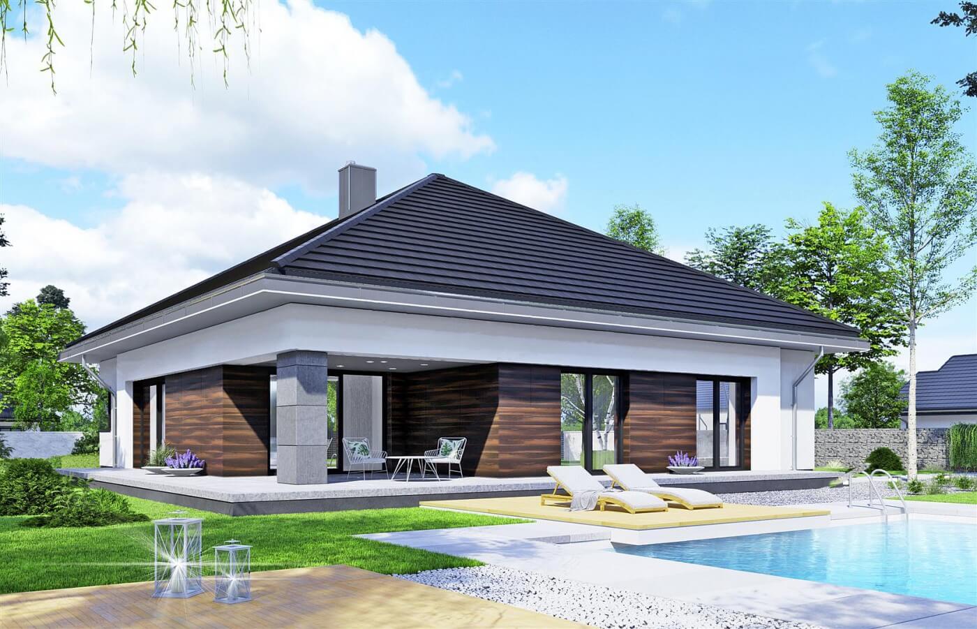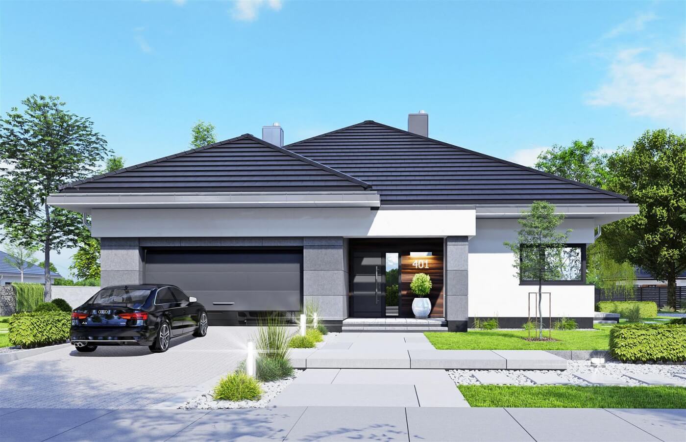 Современный, функциональный одноэтажный дом с двойным гаражом был спроектирован для семьи из четырех человек. Вход в дом, защищенный аркадой, ведет к прихожей с местом для гардероба. Жилая часть дома состоит из удобной кухни с окном с передней стороны дома и просторной гостиной со столовой и зоной отдыха. Широкие террасные двери оптически увеличивают гостиную и столовую. Терраса защищена большой аркадой, которая защищает от солнца и дождя. В гостиной камин может помочь обогреть ваш дом в холодное время года. Спальная зона была четко отделена от остальной части дома, чтобы обеспечить конфиденциальность. В этой части дома были спроектированы три комнаты, в том числе спальня с двуспальной кроватью с гардеробной и собственной ванной комнатой, а также две меньшие спальни. Рядом с ними большая общая ванная комната, прачечная,