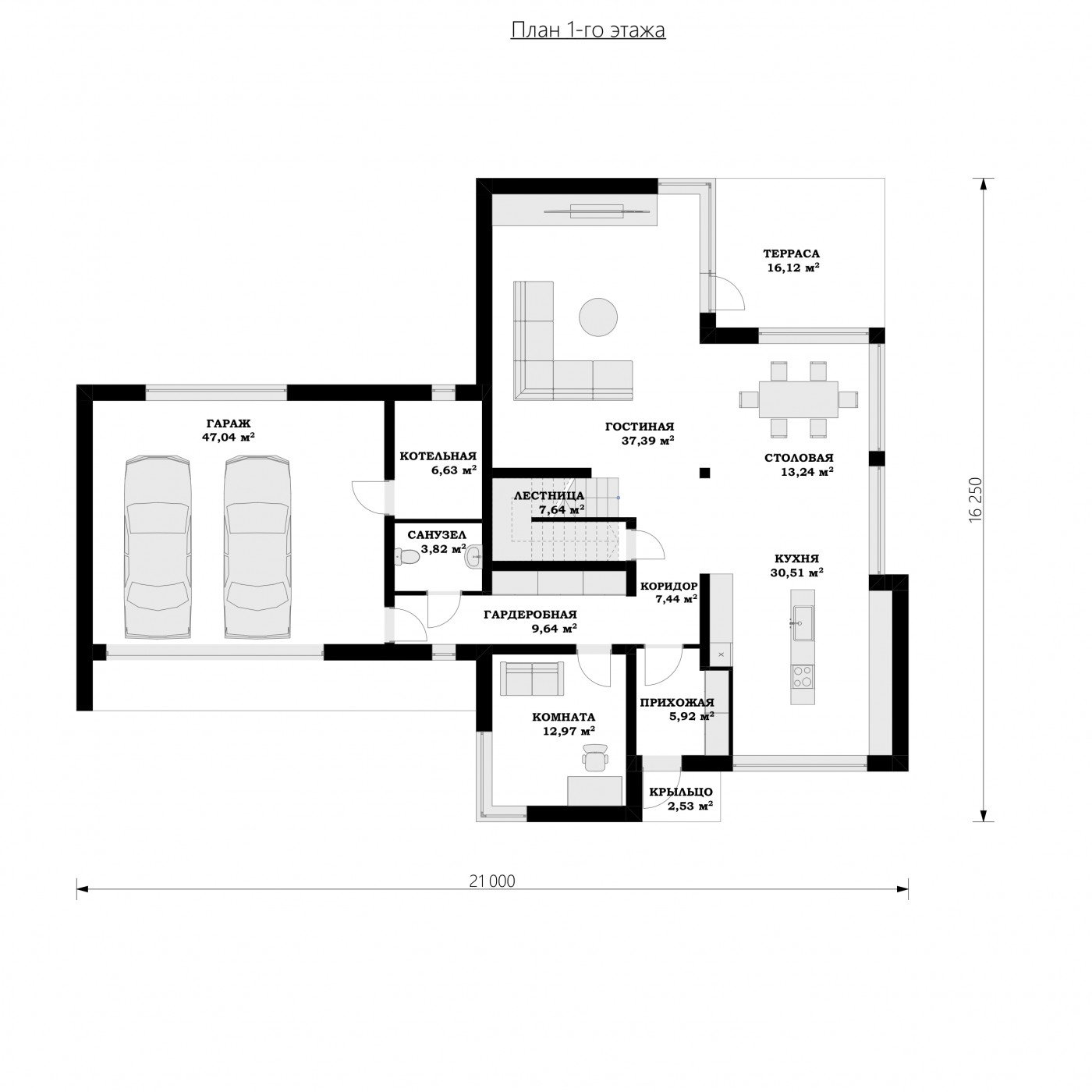 Открытого плана 2-х этажный дом с просторным гаражом, с плоской крышей, с террасой, имеющай габаритные размеры по проекту 16 на 21.