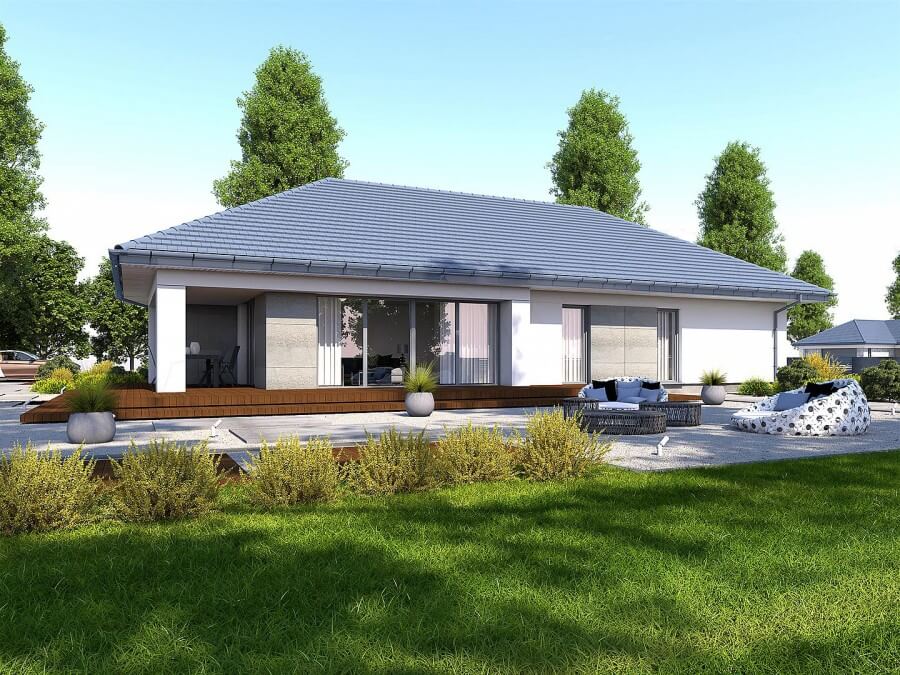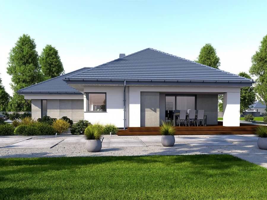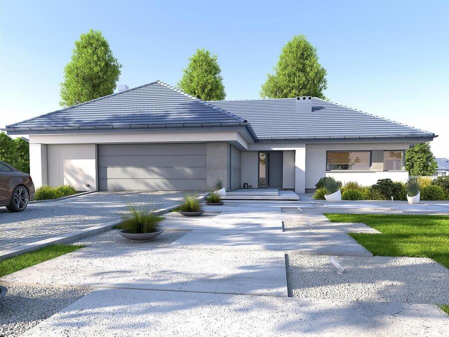 Проект "Мюнхен" - проект одноэтажного дома с гаражом на две машины. Дизайн дома характеризуется привлекательным внешним видом и может быть отделан высококачественной каменной облицовкой, которая усиливает эффект элегантности и стиля. Шатровая крыша с правильным наклоном придает дому правильную пропорцию и стиль. План дома внутри характеризуется продуманным функциональным расположением просторных комнат. Стоит упомянуть многочисленные кладовые и дополнительные помещения, которые позволят убирать вещи до следующего сезона. Дом имеет крытую террасу с элегантными формами, которая является неотъемлемой частью архитектуры дома, создавая единое целое.