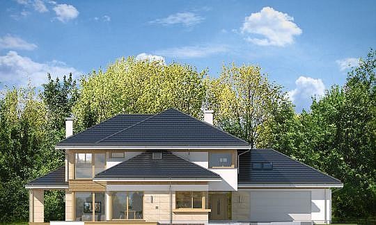 Мы входим в дом через широкую входную дверь с боковыми транцами прямо в красивый вестибюль с гардеробом. Прихожая соединяется с жилой зоной и подсобным помещением дома - с гаражом и большой комнатой за гаражом и кладовкой на чердаке. В жилой зоне у нас есть красивый интерьер объединенной гостиной, зала и столовой, а также кухня, частично скрытая за кладовой. Интерьер гостиной и столовой открыт с широким остеклением на частично крытую террасу и в сад. На первом этаже у нас есть дополнительный кабинет, ванная комната и котельная. На первом этаже, из-за ликвидации пустоты над гостиной, мы можем разместить до пяти спален. Здесь у нас есть квартира для родителей с собственной ванной комнатой и гардеробной, две детские спальни с ванными комнатами и две дополнительные комнаты - спальни или комнаты для любых других целей. Над полом находится большой чердак.