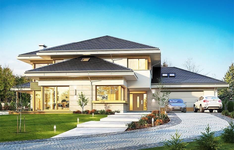 Здание состоит из трех основных блоков: основного одноэтажного ядра, покрытого шатровой крышей, и двух добавленных к нему двухэтажных корпусов, покрытых трехскатной крышей. Современный внешний вид дома усиливается благодаря большому остеклению, фасадным перегородкам, а также каменной и деревянной облицовке. Дизайн будет идеально сочетаться как с городской средой, как городская вилла, так и в более свободных загородных или загородных постройках.