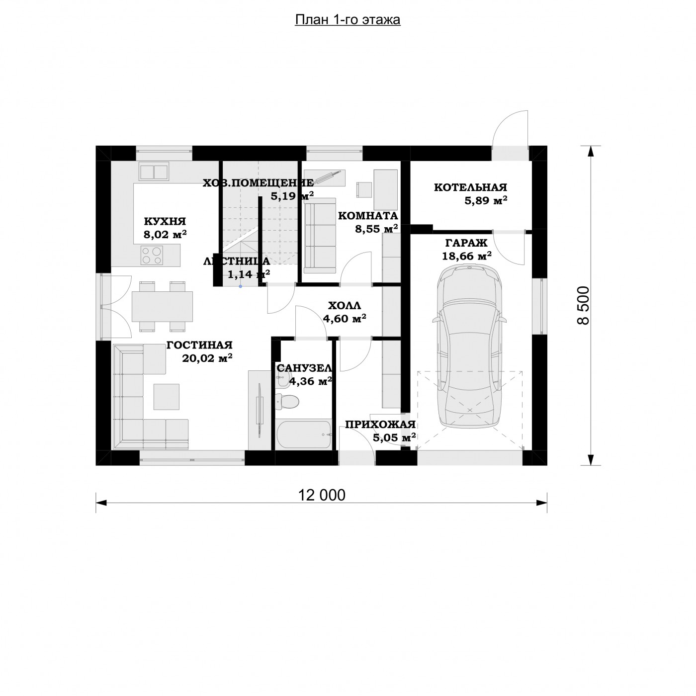 1 этаж 1 прихожая 4,93 м² 2 холл 3,56 м² 3 санузел 4,11 м² 4 гостиная 20 м² 5 кухня 7,78 м² 6 хоз.помещение 1,8 м² 7 комната 8,01 м² 8 котельная 5,4 м² 9 гараж 17,97 м² Всего 73,56 м² |