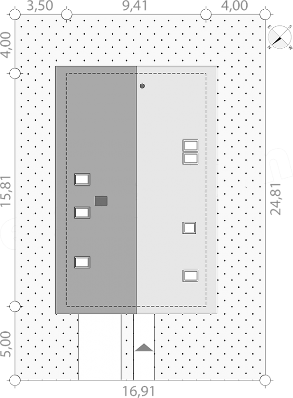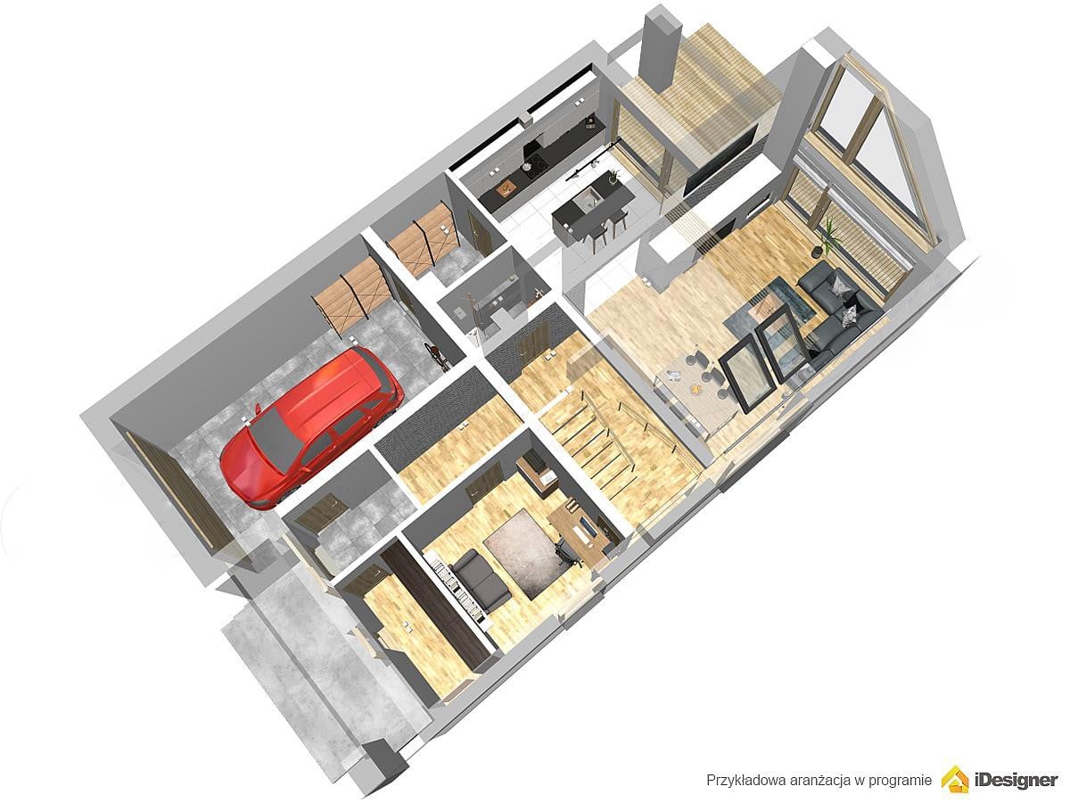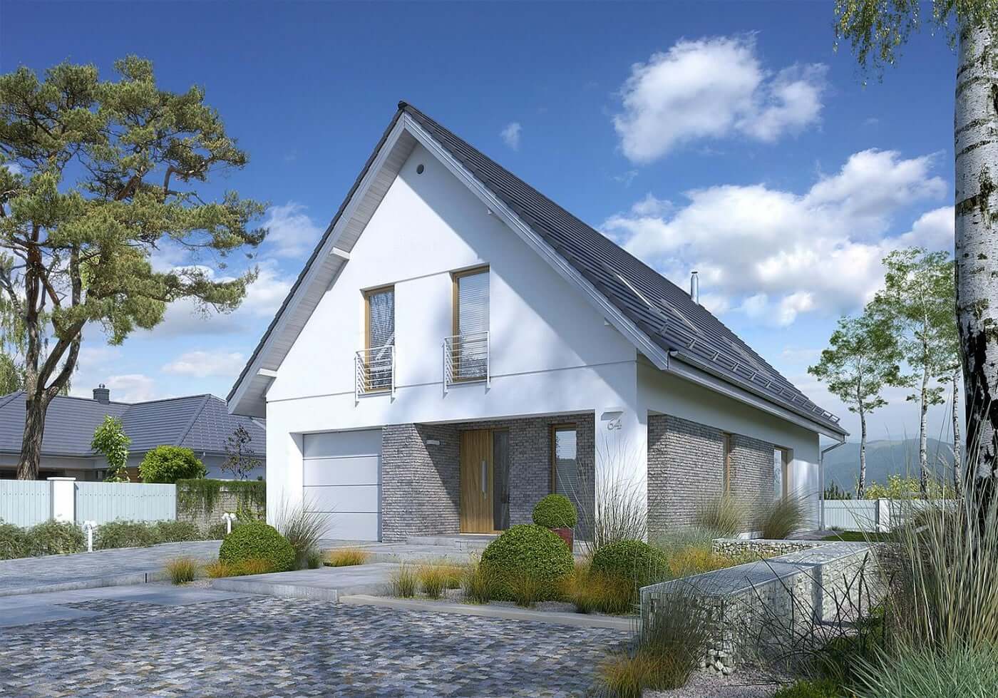 Дом 9 на 15 по проекту «Афины» идеально подойдет под участок средней ширины. В доме предусмотрен единый гараж, встроенный в само здание. Данный вариант отлично подойдет для тех, кто искал дом с двускатной крышей. Это решение делает строительство дешевле и проще.