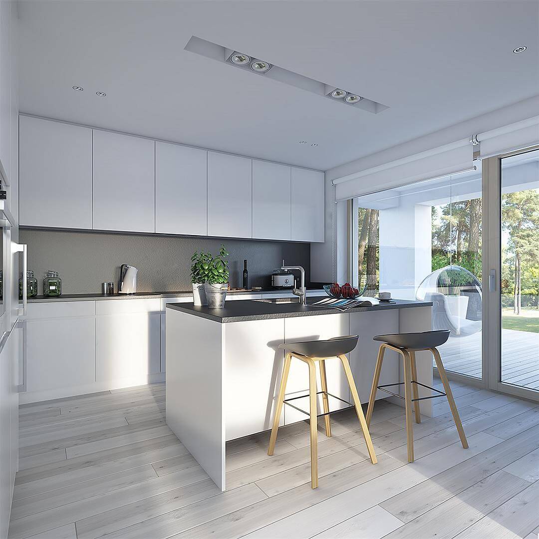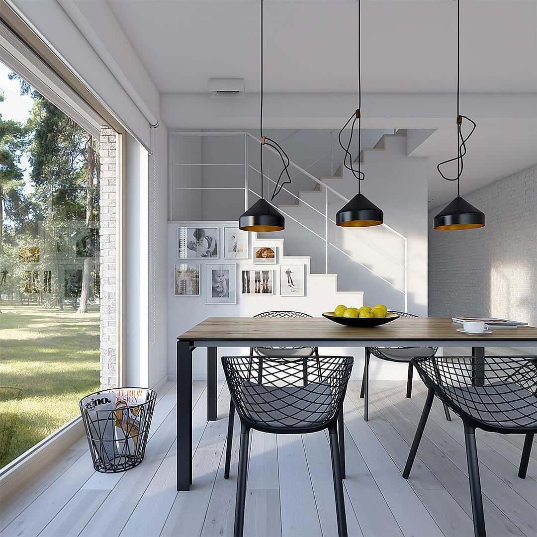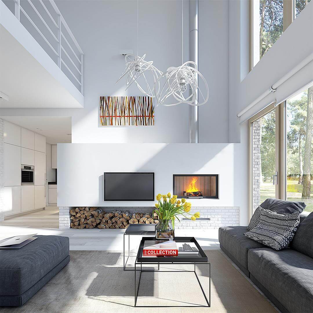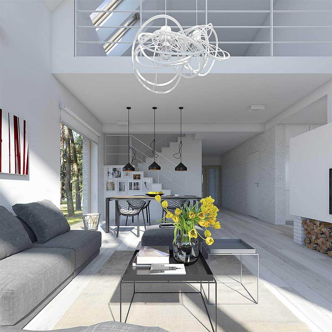 Проходя через вход мы попадаем в отдельную прихожую. За стенкой оборудована спальня. Особенность первого этажа в том, что гостиная и кухня разделены между собой, что в современных проектах встречает уже реже и относится к более «классическим» вариантам. Но у данного решения есть и свои плюсы: кухня оборудована «островком», на котором процесс готовки будет значительно удобнее, а запахи готовых блюд не будут проникать в гостиную. Говоря чуть больше о гостиной – это отдельная зона, которая совмещает в себе и столовую, которая отлично подойдет для приема гостей. Камин в этой зоне создаст неповторимую атмосферу тепла и уюта.