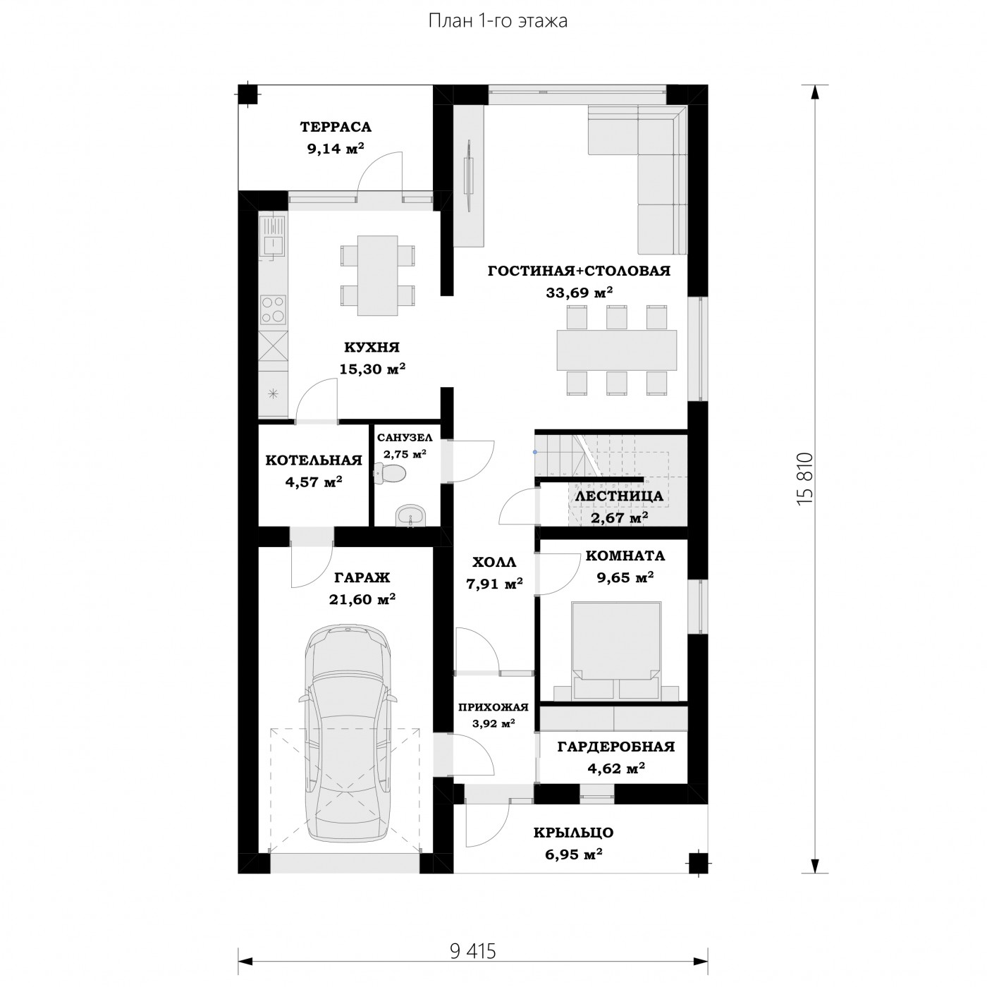 1 этаж 1 прихожая 3,3 м² 2 гардеробная 4,2 м² 3 комната 9,3 м² 4 лестница 1,7 м² 5 холл 7,4 м² 6 гостиная + столовая 28,5 м² 7 кухня 14,9 м² 8 котельная 4,1 м² 9 санузел 2,6 м² 10 гараж 21,7 м² Всего 97,7 м² |