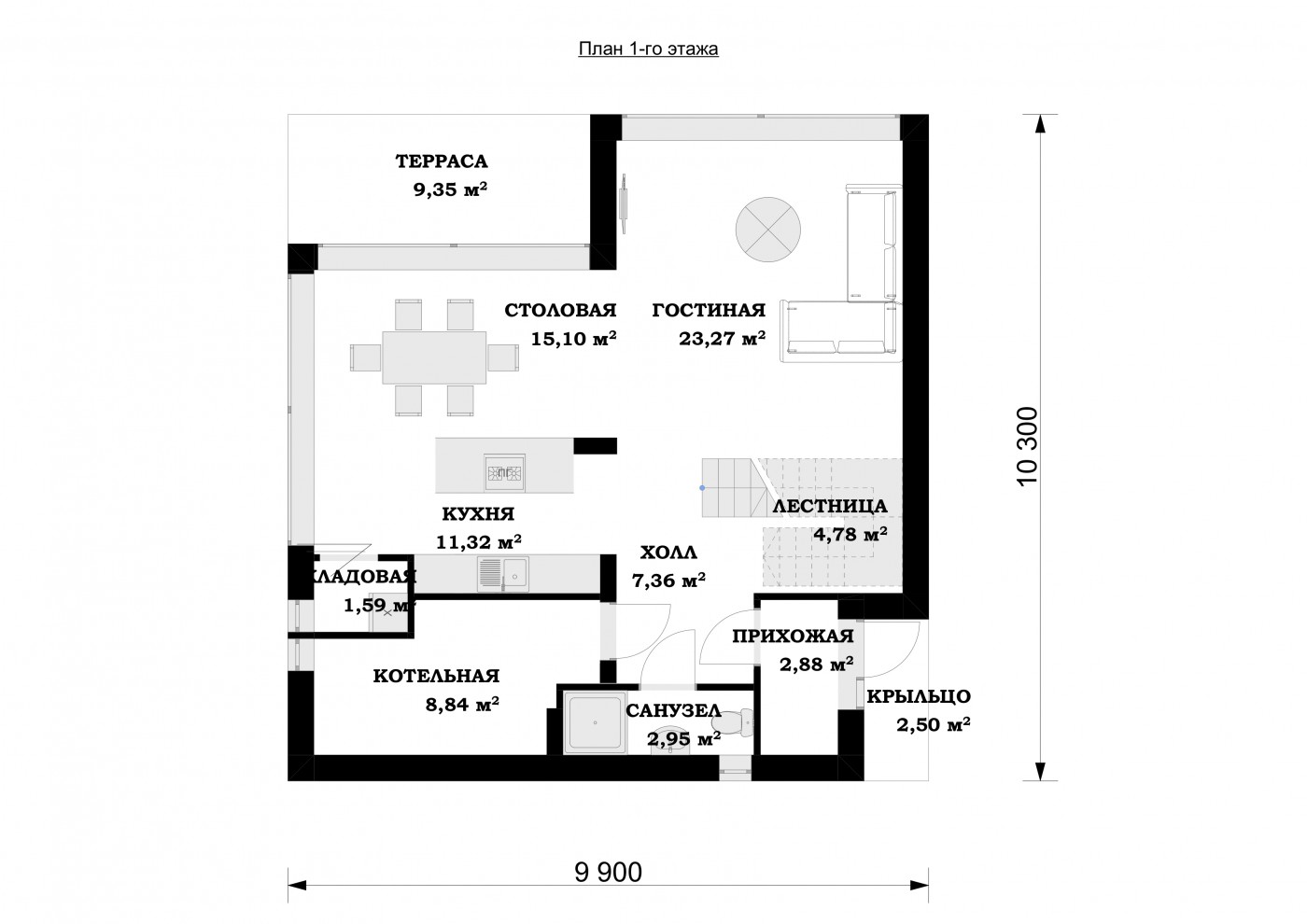 Попадая в дом, мы проходим прихожую и попадает в просторную гостиную, совмещенную со столовой-кухней. По всем современным тенденциям кухня оборудована специальным «островом». Такое решение носит не только эстетический характер, но привносит и практическую пользу. Данная зона оборудована большими окнами, которую будут давать большое количество естественного солнечного света. Также через них будет открываться вид и осуществляться выход на специально оборудованную террасу, которая, в зависимости от выбранных решений, может быть оборудована бассейном.