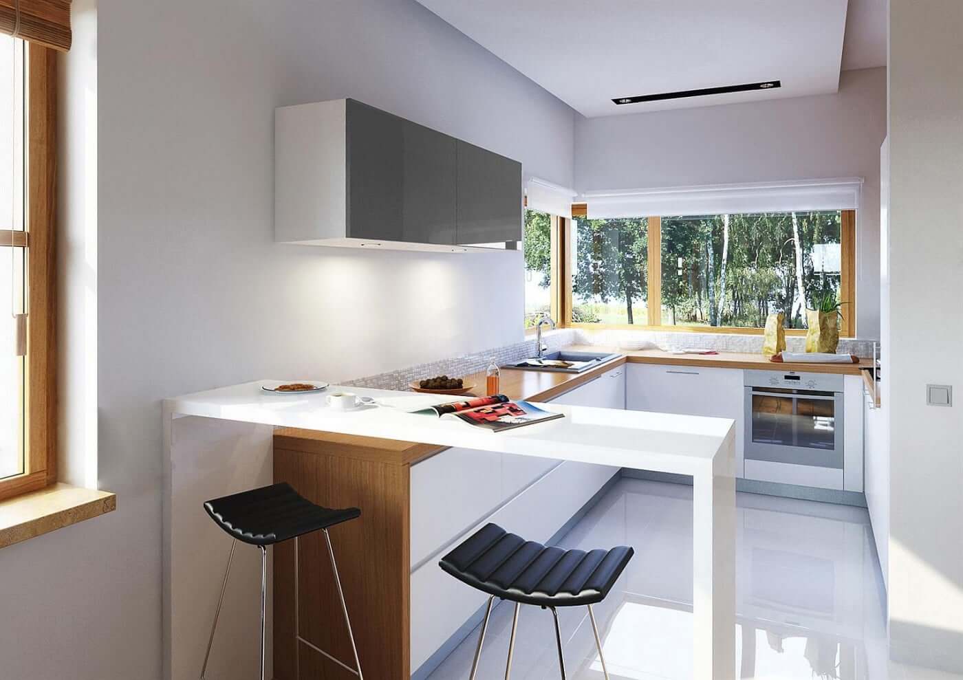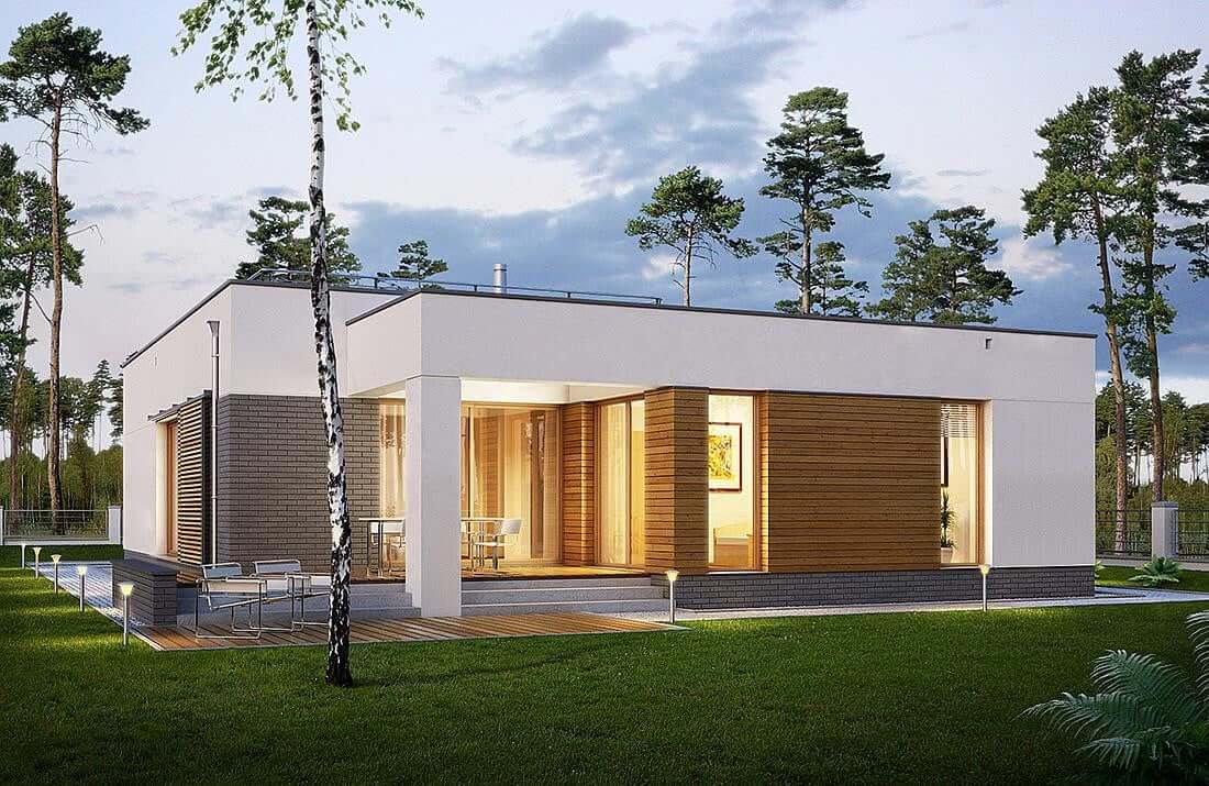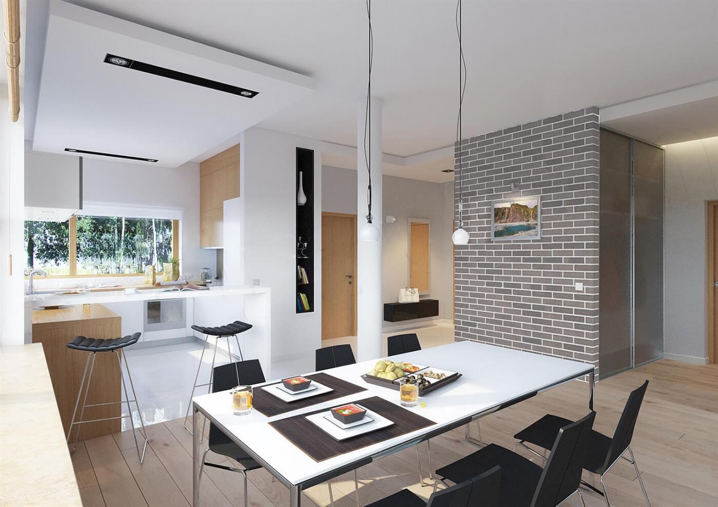 Дизайн дома "Даллас" является идеальным предложением для людей, которые имеют средне широкий участок. Дом с плоской крышей 19 на 12 имеет простой блок, поэтому его реализация не потребит слишком много финансовых ресурсов. Дом был спроектирован для отдельно стоящих зданий. Автор проекта включил двойной гараж форвардов. Конструкция дома покрыта плоской крышей, благодаря чему пол не имеет наклонов и поэтому полностью функционален. Проект "Даллас" - это одноэтажный дом, который делает общение между комнатами очень удобным. Автор проекта предвидел в нем интересную дневную зону. Открытая кухня - идеальное место для семейных и дружеских встреч. На кухне также есть стол, благодаря которому утренние встречи с семьей станут важной частью дня для каждого члена семьи. Дневная зона создается гостиной и столовой, что наверняка удовлетворит сторонников функциональных решений. Интересным элементом, безусловно, является камин, расположенный в гостиной, который придаст интерьеру неповторимую атмосферу. Спальная зона состоит из трех комнат, что является отличным вариантом для небольшой семьи. Пространство также может быть использовано в качестве комнаты для гостей или учебы. Для людей, которые ценят хорошую организацию, важной комнатой является гардероб, представленный в дизайне. Комфортное использование дома также зависит от подсобного помещения, включенного в него. Общие барбекю и семейные трапезы будут дополнены террасой, включенной в проект. Технология кирпича, рекомендованная архитектором, обеспечивает прочность и прочность конструкции. Его внешний вид усиливает характеристики современного стиля, который идеально подходит для людей, которые ценят новейшие решения.