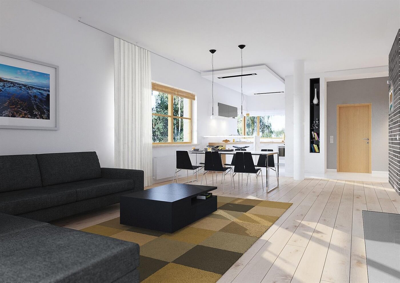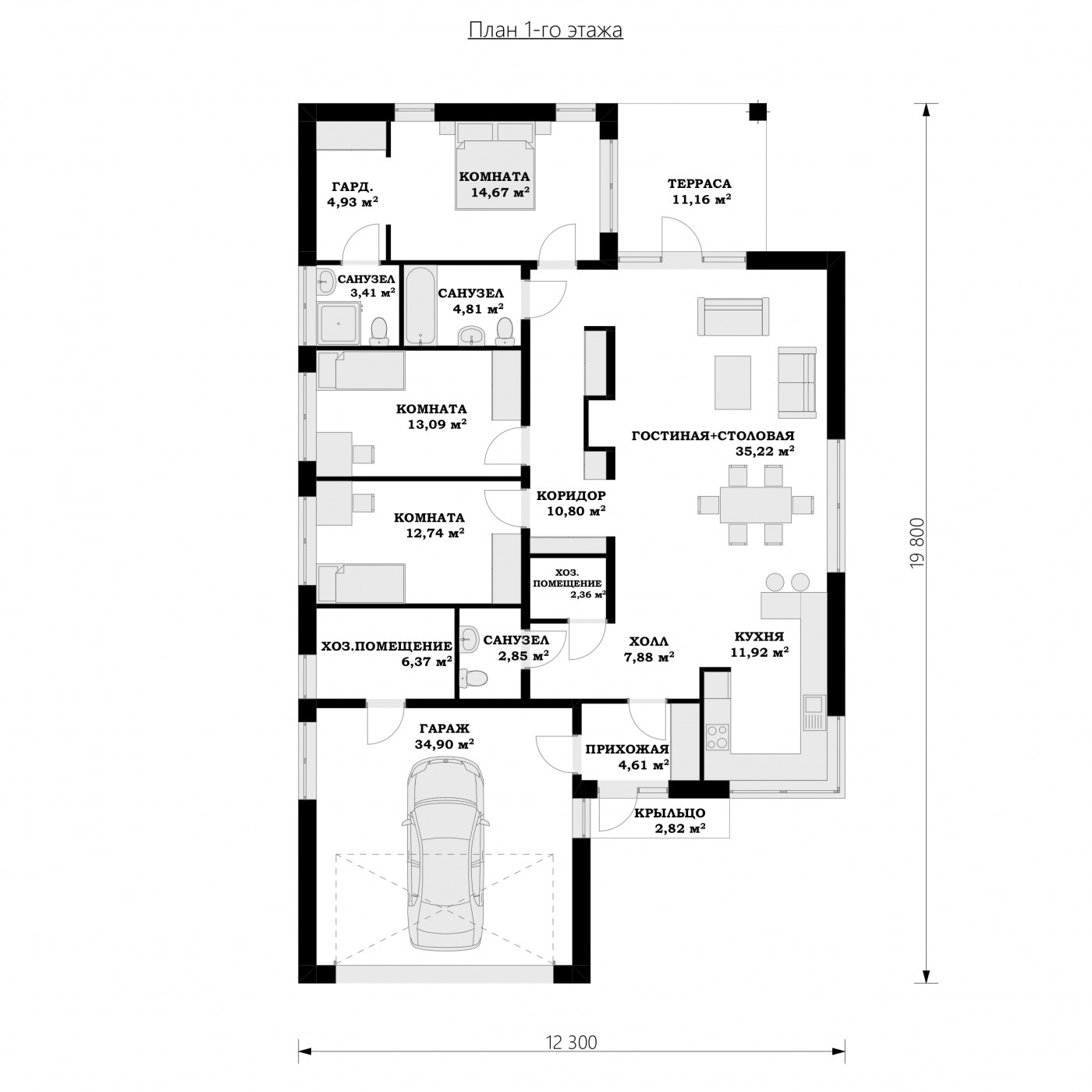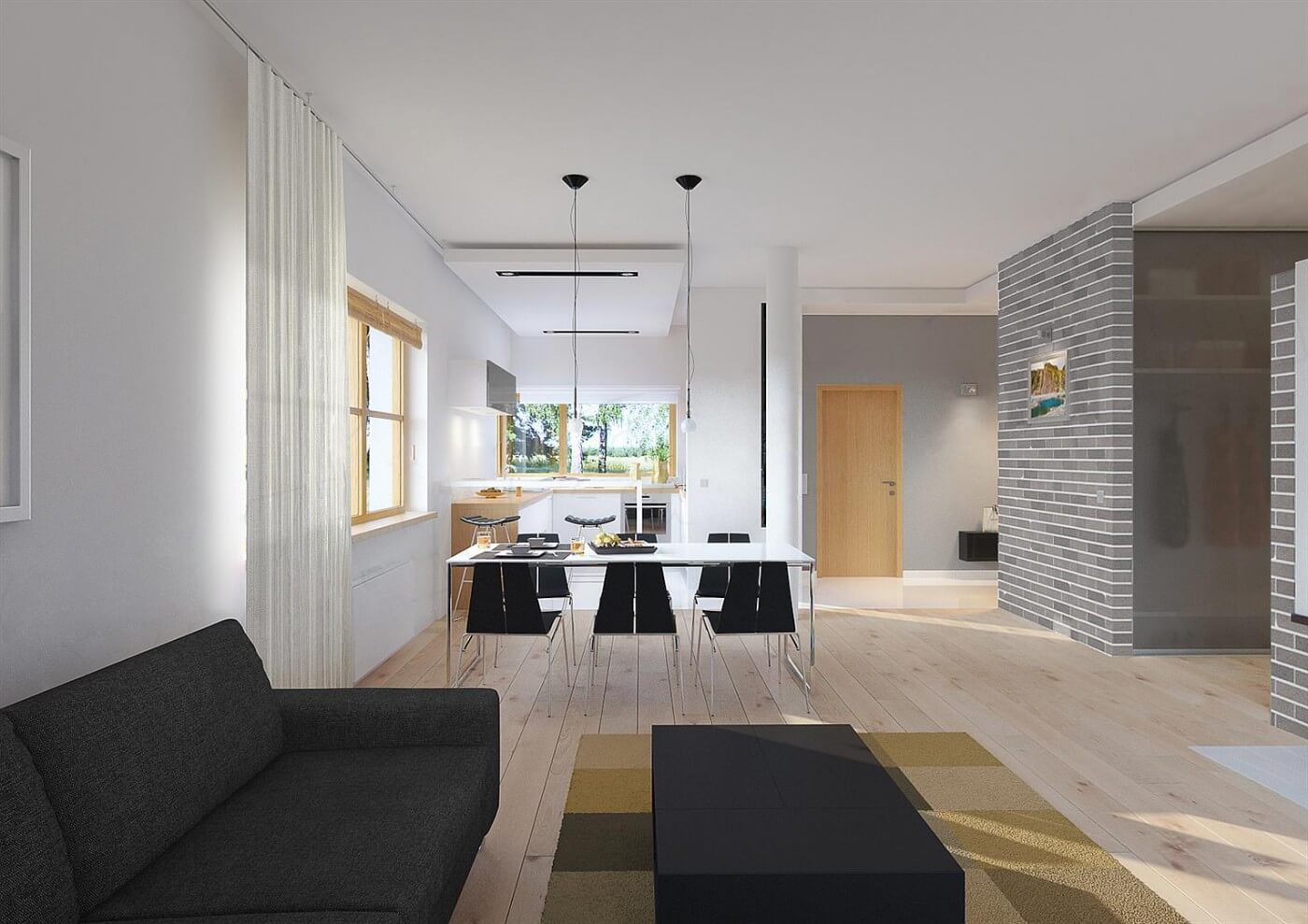 Дизайн дома "Даллас" является идеальным предложением для людей, которые имеют средне широкий участок. Дом с плоской крышей 19 на 12 имеет простой блок, поэтому его реализация не потребит слишком много финансовых ресурсов. Дом был спроектирован для отдельно стоящих зданий. Автор проекта включил двойной гараж форвардов. Конструкция дома покрыта плоской крышей, благодаря чему пол не имеет наклонов и поэтому полностью функционален. Проект "Даллас" - это одноэтажный дом, который делает общение между комнатами очень удобным. Автор проекта предвидел в нем интересную дневную зону. Открытая кухня - идеальное место для семейных и дружеских встреч. На кухне также есть стол, благодаря которому утренние встречи с семьей станут важной частью дня для каждого члена семьи. Дневная зона создается гостиной и столовой, что наверняка удовлетворит сторонников функциональных решений. Интересным элементом, безусловно, является камин, расположенный в гостиной, который придаст интерьеру неповторимую атмосферу. Спальная зона состоит из трех комнат, что является отличным вариантом для небольшой семьи. Пространство также может быть использовано в качестве комнаты для гостей или учебы. Для людей, которые ценят хорошую организацию, важной комнатой является гардероб, представленный в дизайне. Комфортное использование дома также зависит от подсобного помещения, включенного в него. Общие барбекю и семейные трапезы будут дополнены террасой, включенной в проект. Технология кирпича, рекомендованная архитектором, обеспечивает прочность и прочность конструкции. Его внешний вид усиливает характеристики современного стиля, который идеально подходит для людей, которые ценят новейшие решения.