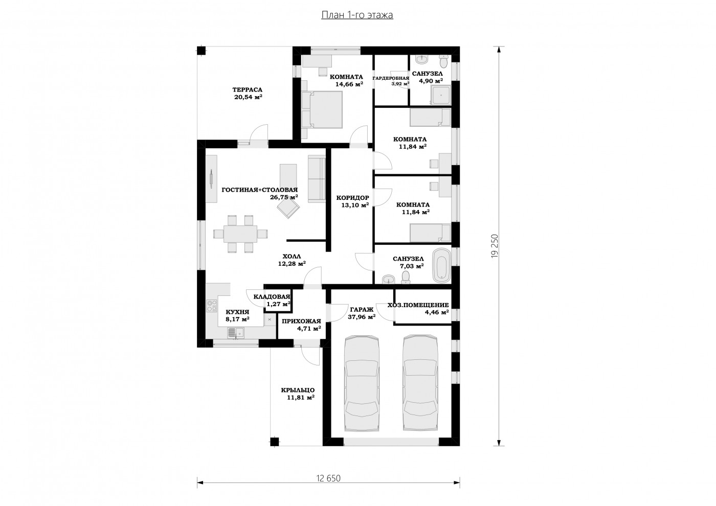 1 этаж 1 прихожая 4,6 м² 2 холл 7,6 м² 3 кладовая 1,3 м² 4 кухня 8,1 м² 5 гостиная + столовая 32,4 м² 6 коридор 8,2 м² 7 комната 14,5 м² 8 гардеробная 3,6 м² 9 санузел 4,7 м² 10 комната 11,5 м² 11 комната 11,5 м² 12 санузел 6,5 м² 13 хоз. помещение 4,4 м² 14 гараж 36 м² Всего 154,9 м² |