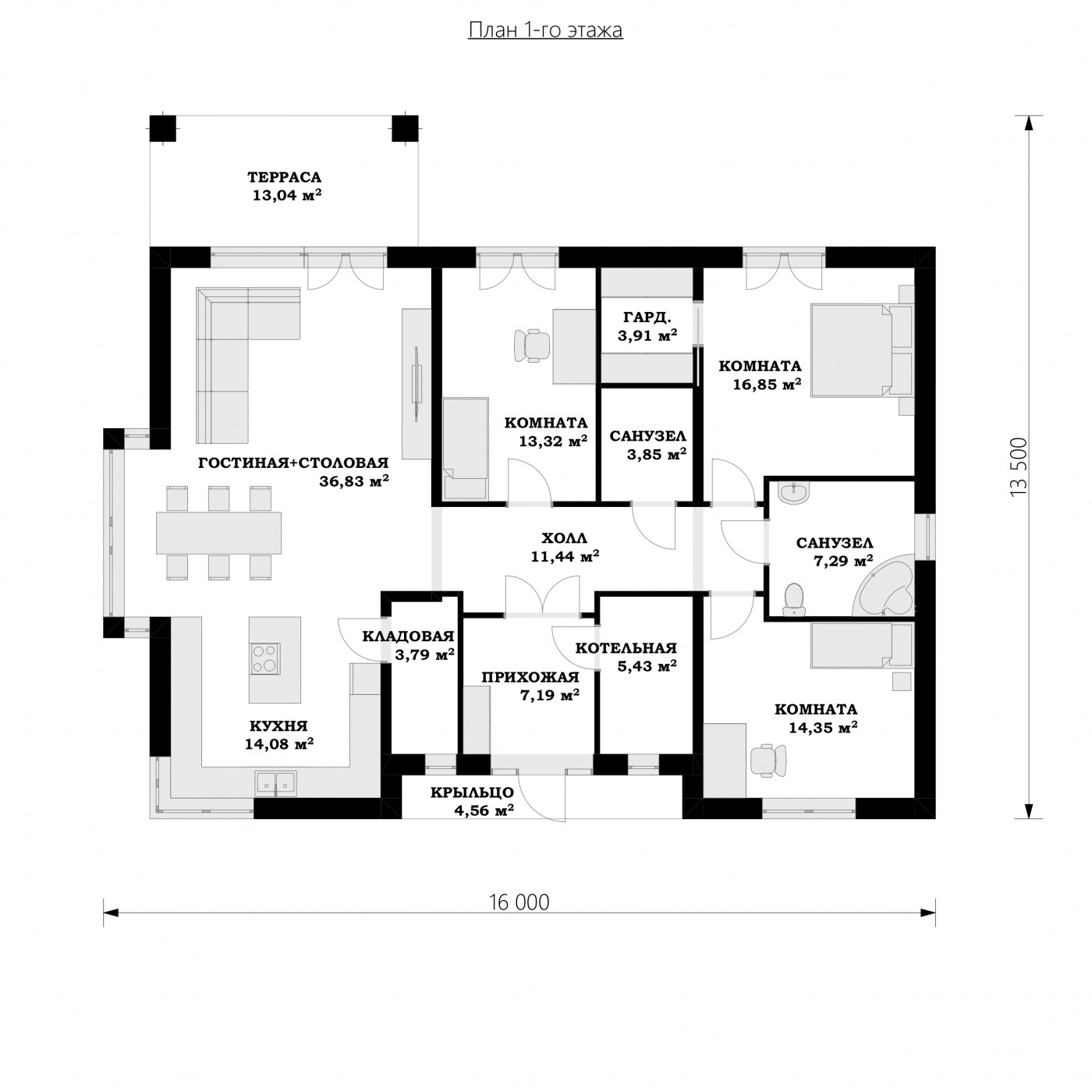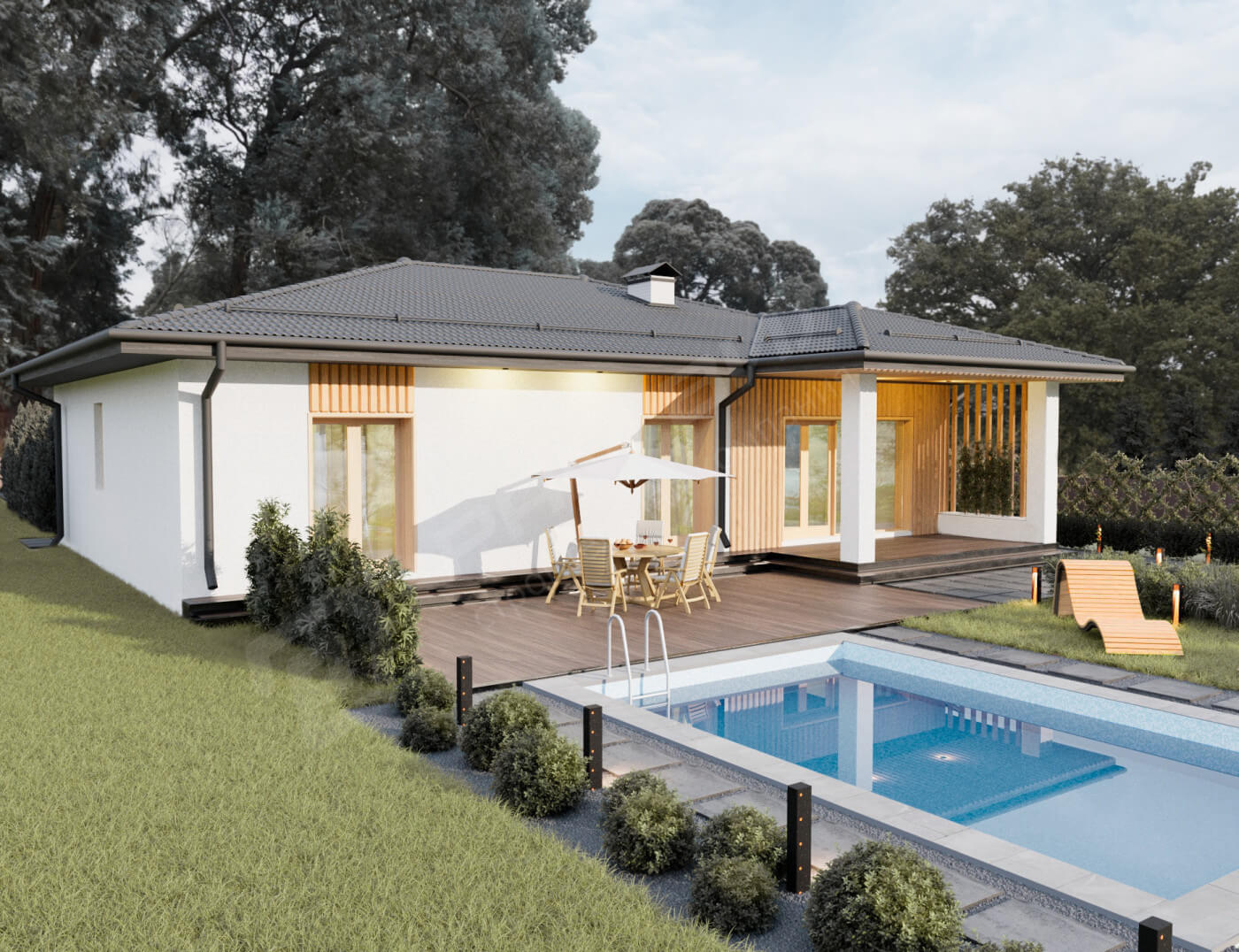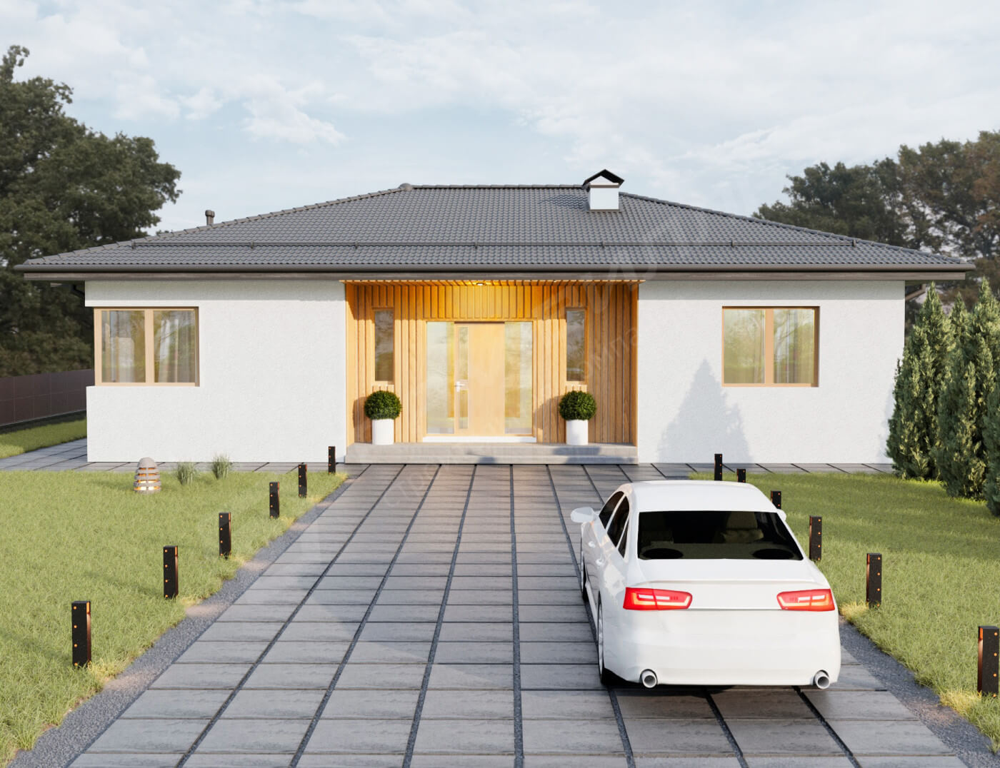 Проект "Белград" представляет собой одноэтажное здание с многоэтажной крышей, предназначенное для отдельно стоящих зданий. Здание с полезной площадью 128,02 м2 имеет просторную дневную зону с открытой кухней. Небольшая кладовая была спроектирована рядом с кухней. Жилая зона включает в себя гостиную и столовую. Дизайн включает в себя как ванную комнату, так и отдельный туалет, что будет очень полезно при посещении гостей. В доме три просторные спальни, в том числе одна с гардеробной, что делает его отличным выбором для семьи из 4 человек. Благодаря тому, что дом одноэтажный, общение между комнатами очень приятное. Кроме того, есть котельная с собственным входом из тамбура, который можно адаптировать к газовому и твердотопливному котлу. Преемственность между интерьером дома и сада соединена просторной террасой. Проект "Белград" функционален и упорядочен во всех отношениях, а благодаря своей простой форме он дешев в строительстве. Его внешний вид заставит его выглядеть великолепно в любом месте, независимо от области.